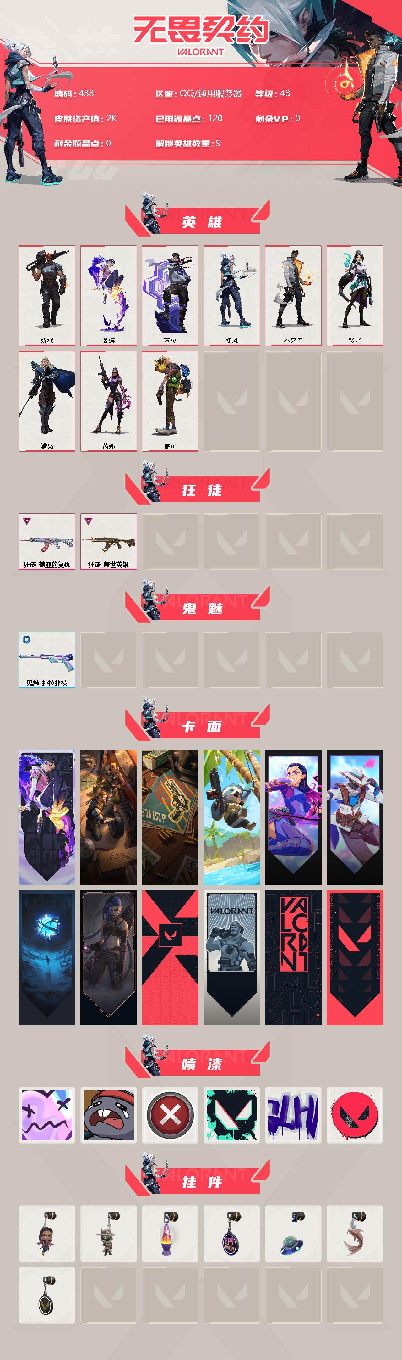 [12957868]【英雄】:炼狱,暮蝶,壹决,捷风,不死鸟,贤者,猎枭,芮娜,盖可 【狂徒】:狂徒-盖世英雄,狂徒-盖亚的复仇 【鬼魅】:鬼魅-扑棱扑棱 【卡面】:无畏契约:暮蝶 卡面,修车达人 卡面,正义的化身 卡面,树懒大作战 卡面,无畏契约GO!第一卷:芮娜 卡面,无畏契约GO!第一卷:零 卡面,无垠星环 卡面,《双城之战》金克丝 卡面,代号红色 卡面,新兵报到 卡面,V契约 卡面,无畏契约 卡面 【喷漆】:伤心心 喷漆,熊抱 喷漆,买装还是存钱 喷漆,胜利属于无畏契约 喷漆,GLHF 喷漆,无畏契约 喷漆 【挂饰】:无畏契约GO!第一卷 芮娜 挂饰,无畏契约GO!第一卷 零 挂饰,熔岩灯 挂饰,第九季//第二幕 纪念币 挂饰,天外飞客 挂饰,红鳞松叶 挂饰,无畏契约 纪念币 挂饰