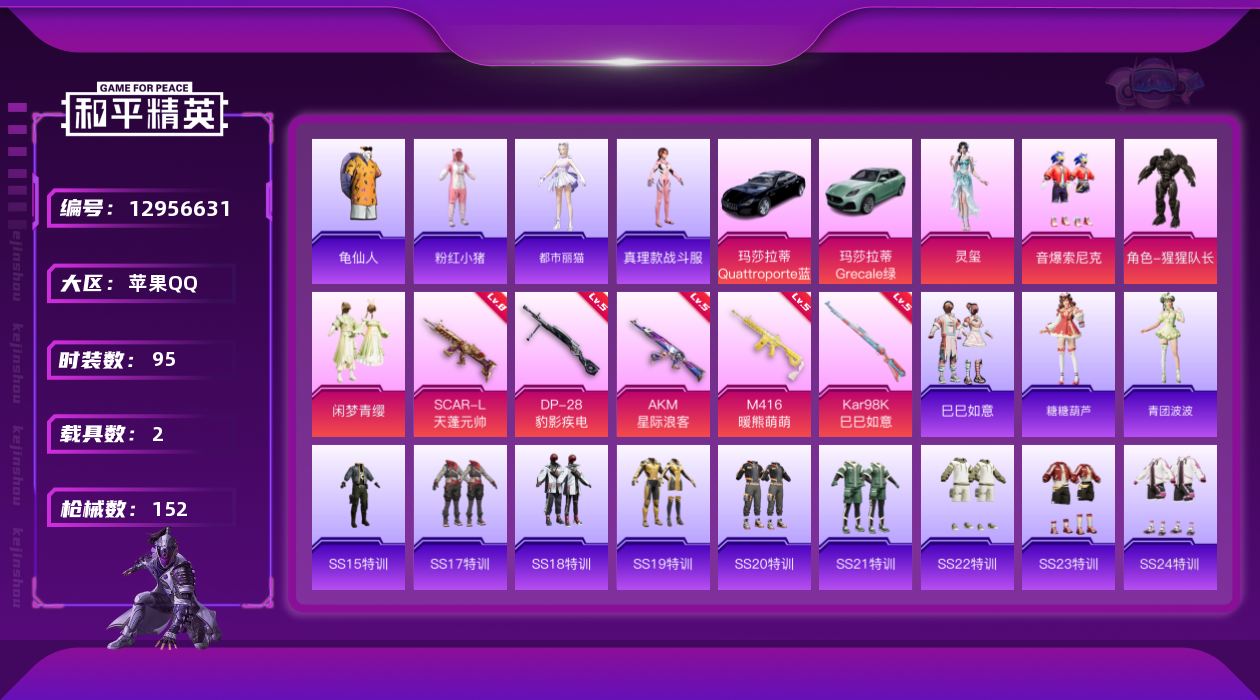 [12956631]素材身法号 苹果 手Q-5粉装-5特效枪-2载具-4.8w热力值-7王牌印记-95套装-152枪皮【热门品类】:粉装-梦幻火箭,粉装-音爆索尼克,套装-龟仙人,套装-粉红小猪【粉色载具】:玛莎拉蒂Quattroporte(夜幕蓝),玛莎拉蒂Grecale(薄荷绿)【粉色套装】:粉装-梦幻火箭,粉装-音爆索尼克,角色-猩猩队长,粉装-闲梦青缨,角色-灵玺【粉色枪皮等级】:AKM-星际浪客(五级),SCAR-L-天蓬元帅(八级),M416-暖熊萌萌(五级),Kar98K-巳巳如意(五级),DP-28-豹影疾电(五级)
