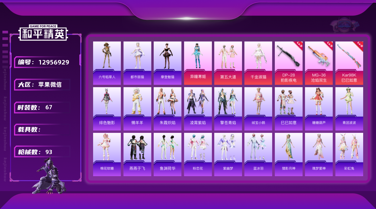 - PX_2095193-时装数: 126 枪械数: 198 战备数: 152 热门装扮: 奇异狩猎者,荒野猎神,宝贝奶油派,鹰眼刺客,东方飞龙,未来领航者 稀有枪皮: 七级AKM-甜心宝贝,六级M416-心之恋语,二级AKM-星际浪客,五级M416-电玩时刻,五级UMP45-量子极限,五级GROZA-镜光银凌,五级Kar98K-巳巳如意,五级AUG-暖羊咩咩,