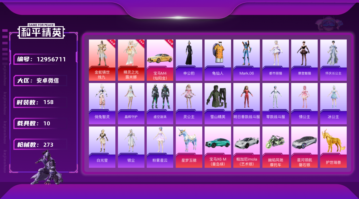 [12956711]素材身法号/宝马M4(灿阳金)(五级)/M416-灵猫魔法师(九级) 安卓 微信-2神装-22粉装-28特效枪-10载具-23粉色飞行器-12.4w热力值-12王牌印记-158套装-273枪皮【红色载具】:宝马M4(灿阳金)(五级)【红色神装等级】:金蛇镇世-烛九(三级),精灵之光-露米娜(一级)【热门品类】:粉装-梦幻火箭,粉装-繁龙极客,角色-军刀雅典娜,套装-龟仙人,角色-Mark.06【粉色载具】:宝马M4(灿阳金),宝马X6 M(曼岛绿),帕加尼imola(艺术银),星河领航(磐石银),合金龙骨(蓝),幽焰风驰摩托车,僚机-萌兔起飞,僚机-圣域龙宝,星梦玉骢,护世瑞兽【粉色套装】:粉装-数码大师,粉装-梦幻火箭,粉装-放客神游,粉装-新星烈龙,粉装-冰霜白皇,粉装-星之彼岸,粉装-彩虹鹿灵,角色-2号机款机体服,粉装-恐龙拽拽,角色-阿尔茜,角色-圣堂之誓,粉装-繁龙极客,角色-小蓝,角色-美琪,角色-光极星,套装-创世·救赎,角色-星梦奇缘,角色-千金淑猫,角色-月影灵韵,角色-女娲灵识,角色-智耀战神,角色-绯穹魔姬【粉色枪皮等级】:AKM-幽焰骑士(五级),SCAR-L-甜梦小狐(二级),SCAR-L-纯梦嫁纱(二级),SCAR-L-金蛇镇世(六级),M416-风花雪月(一级),M416-超新星(二级),M416-墨龙九天(二级),M416-女娲灵识(一级),M416-灵猫魔法师(九级),GROZA-焦糖拿铁(五级),GROZA-精灵之光(六级),AUG-星之彼岸(五级),M762-激战未来(四级),UMP45-相思残雪(六级),UMP45-量子极限(五级),AKS-74U-信仰神谕(四级),P90-沙丘之主(三级),Kar98K-巳巳如意(五级),Kar98K-圣域龙灵(一级),M24-镜域双华(一级),Mk14-精灵梦叶罗丽(三级),Mk14-盛世惊鸿(六级),DP-28-圣堂之誓(四级),DP-28-千金淑猫(一级),DP-28-豹影疾电(五级),烟雾弹-丁香清露(四级),破片手榴弹-热量炸弹(七级)【粉色飞行器】:酣梦熊熊飞行器,梦幻火箭飞行器,星之彼岸飞行器,齐天大圣飞行器,变形金刚飞行器,沙丘之主天马,镜域双华-灵镜之阶,电糖天使飞行器,龙翔九天飞行器,深渊漩涡飞行器,曦光华影飞行器,幽焰列车飞行器,脆鲨七海飞行器,凤舞九天飞行器,万象