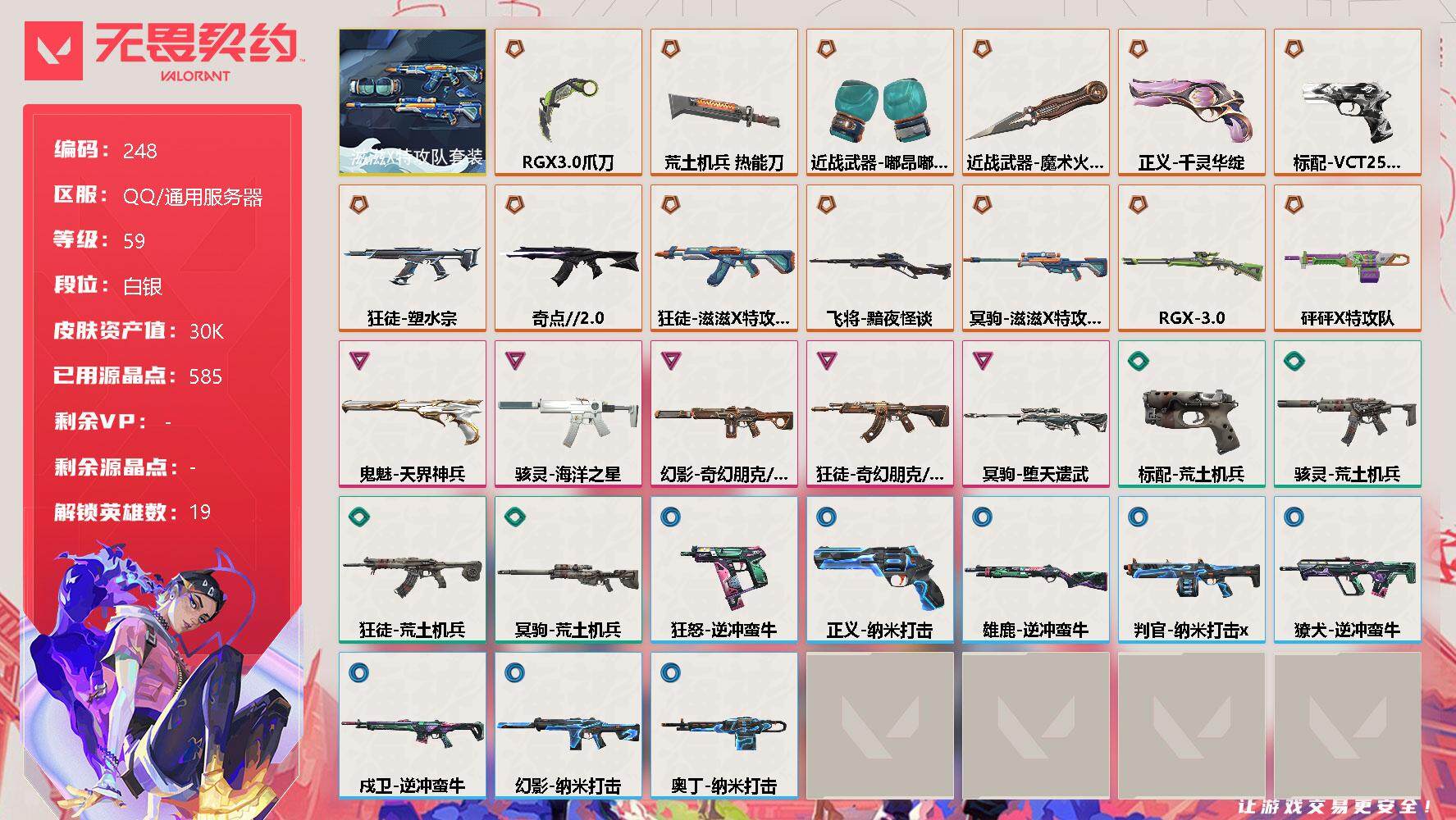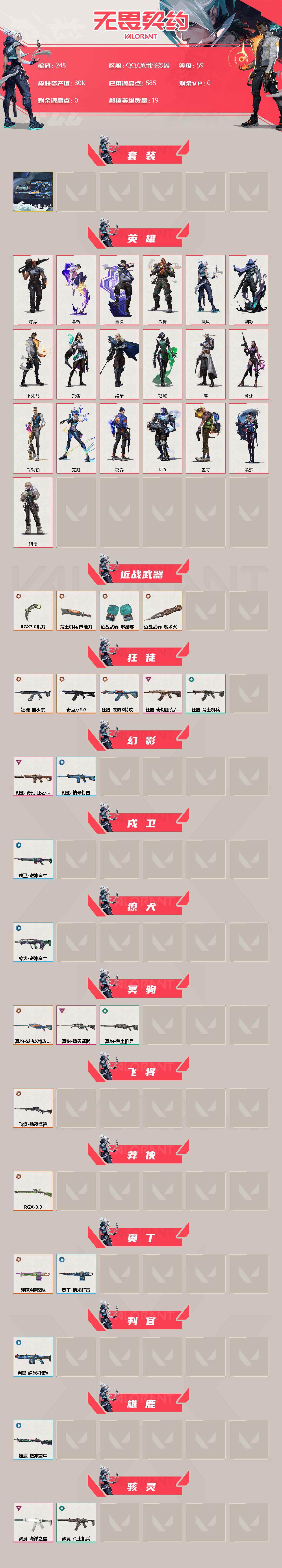 [12956343]【套装】:滋滋X特攻队套装 【英雄】:炼狱,暮蝶,壹决,铁臂,捷风,幽影,不死鸟,贤者,猎枭,蝰蛇,零,芮娜,尚勃勒,霓虹,夜露,K/O,盖可,黑梦,钢锁 【近战 武器】:近战武器-魔术火花,近战武器-嘟昂嘟昂超弹力水球拳套,近战武器-RGX 11z Pro//3.0 爪刀,近战武器-荒土机兵 热能刀,近战武器-魔术火花 【狂徒】:狂徒-奇点//2.0,狂徒-塑水宗,狂徒-滋滋X特攻队,狂徒-奇幻朋克//3.0,狂徒-荒土机兵 【幻影】:幻影-奇幻朋克//3.0,幻影-纳米打击 【戍卫】:戍卫-逆冲蛮牛 【獠犬】:獠犬-逆冲蛮牛 【冥驹】:冥驹-滋滋X特攻队,冥驹-堕天遗武,冥驹-荒土机兵 【飞将】:飞将-黯夜怪谈 【莽侠】:莽侠-RGX 11z Pro//3.0 【奥丁】:奥丁-砰砰X特攻队,奥丁-纳米打击 【判官】:判官-纳米打击x 【雄鹿】:雄鹿-逆冲蛮牛 【骇灵】:骇灵-海洋之星,骇灵-荒土机兵 【标配】:标配-荒土机兵 【VCT手枪】:标配-VCT25 x TS 【正义】:正义-千灵华绽,正义-纳米打击 【鬼魅】:鬼魅-天界神兵 【狂怒】:狂怒-逆冲蛮牛 【卡面】:终章:激斗汉堡 卡面,进入射程 卡面,分崩离析 卡面,纳米打击 卡面,抑制技术 卡面,激斗汉堡 卡面,瓦娃脸雪糕 P2 卡面,从黄昏到黎明 卡面,荒土机兵 卡面,银弹猎手 卡面,逆冲蛮牛 卡面,《双城之战》拥抱 卡面,精灵大战 卡面,欢迎来到底城 卡面,南瓜盛典 卡面,修车达人 卡面,正义的化身 卡面,梦幻奶茶 卡面,无畏契约GO!第一卷:芮娜 卡面,无畏契约GO!第一卷:零 卡面,代号红色 卡面,新兵报到 卡面,V契约 卡面,无畏契约 卡面 【喷漆】:小小心意 喷漆,战“素”兔 喷漆,宇宙的指引 喷漆,请求重启 喷漆,逆冲蛮牛 喷漆,纳米打击 喷漆,鼻尖上的蝴蝶 喷漆,简笔画黯兽 喷漆,独守蝰腹 喷漆,他们将落荒而逃 喷漆,通缉:战术企鹅 喷漆,荒土机兵 喷漆,别挡我吃球! 喷漆,嗨宝南瓜灯 喷漆,嘭! 喷漆,都算到了 喷漆,控场勿近 喷漆,熊抱 喷漆,买装还是存钱 喷漆,无畏契约GO!第一卷:零 喷漆,胜利属于无畏契约 喷漆,GLHF 喷漆,无畏契约 喷漆 【挂饰】:终章:猫猫木乃伊 挂饰,荒土机兵 挂饰,悠闲鸡块 挂饰,猫猫木乃伊 挂饰,水壶 挂饰,纳米打击 挂饰,逆冲蛮牛 挂饰,可爱糖
