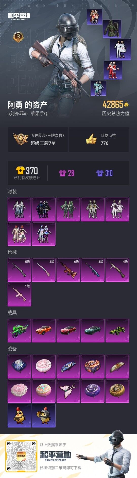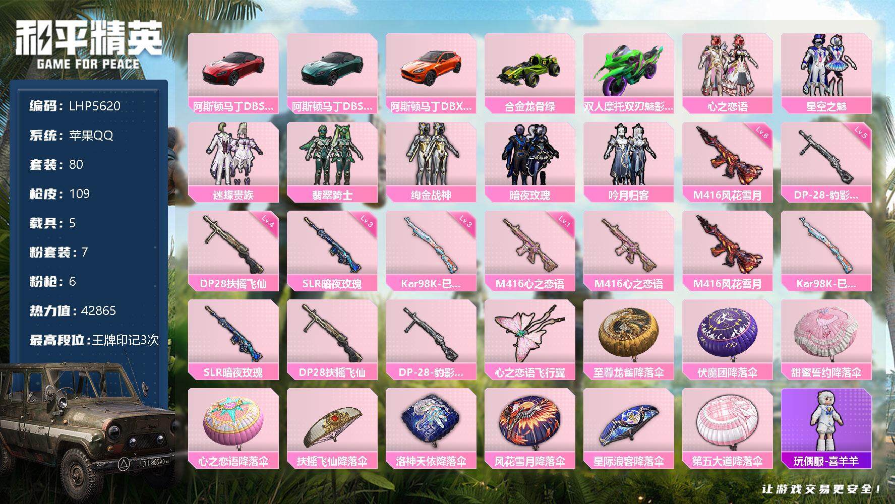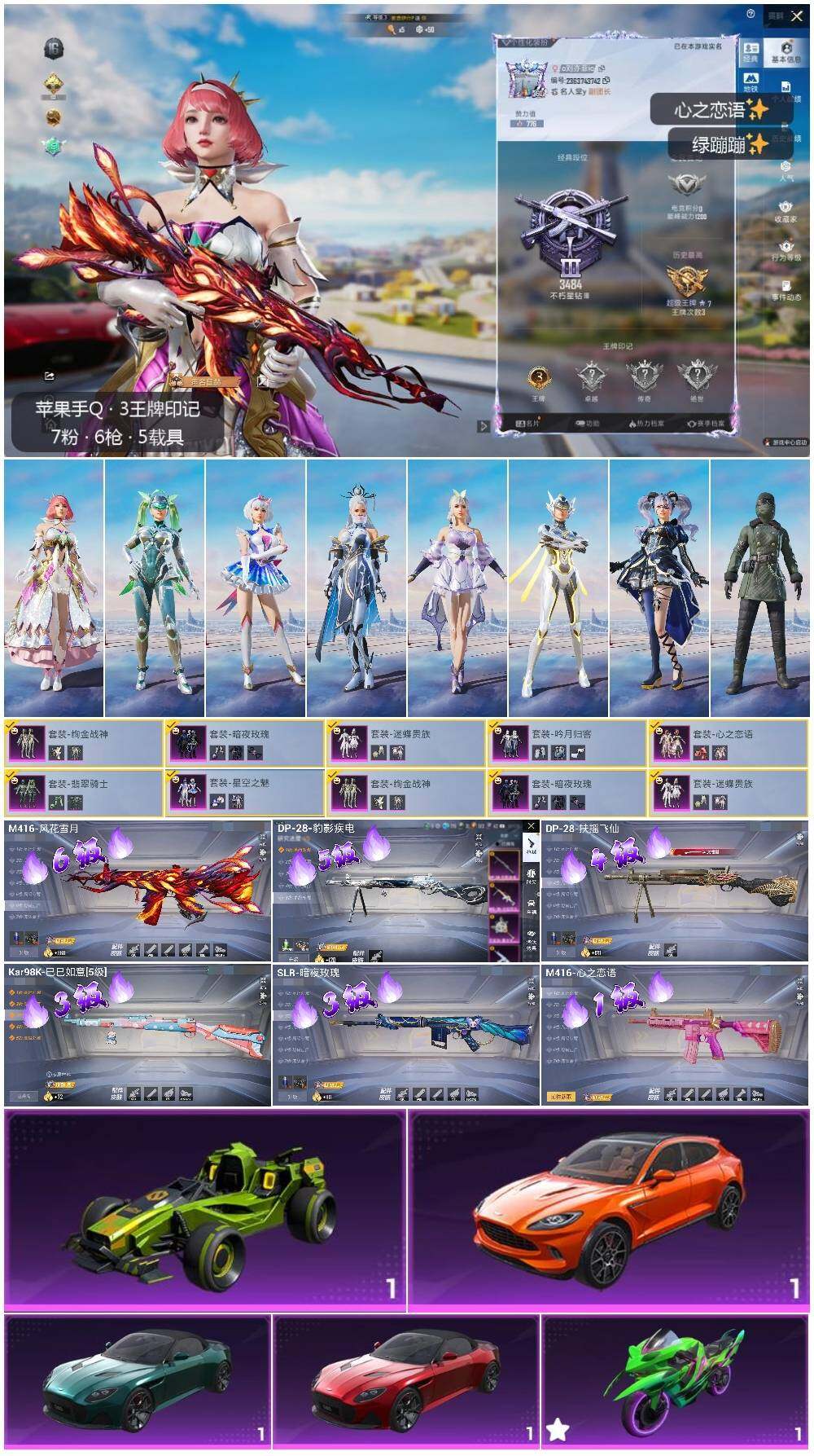 [12956534]素材身法号 苹果 手Q-7粉装-6特效枪-5载具-1粉色飞行器-4.2w热力值-3王牌印记-80套装-109枪皮【粉色载具】:阿斯顿马丁DBS(红),阿斯顿马丁DBS(绿),阿斯顿马丁DBX(橙),合金龙骨(绿),双人摩托-双刃魅影(绿)【粉色套装】:粉装-心之恋语,粉装-星空之魅,粉装-迷蝶贵族,粉装-翡翠骑士,粉装-绚金战神,粉装-暗夜玫瑰,粉装-吟月归客【粉色枪皮等级】:M416-心之恋语(一级),M416-风花雪月(六级),Kar98K-巳巳如意(三级),SLR-暗夜玫瑰(三级),DP-28-扶摇飞仙(四级),DP-28-豹影疾电(五级)【粉色飞行器】:心之恋语飞行翼