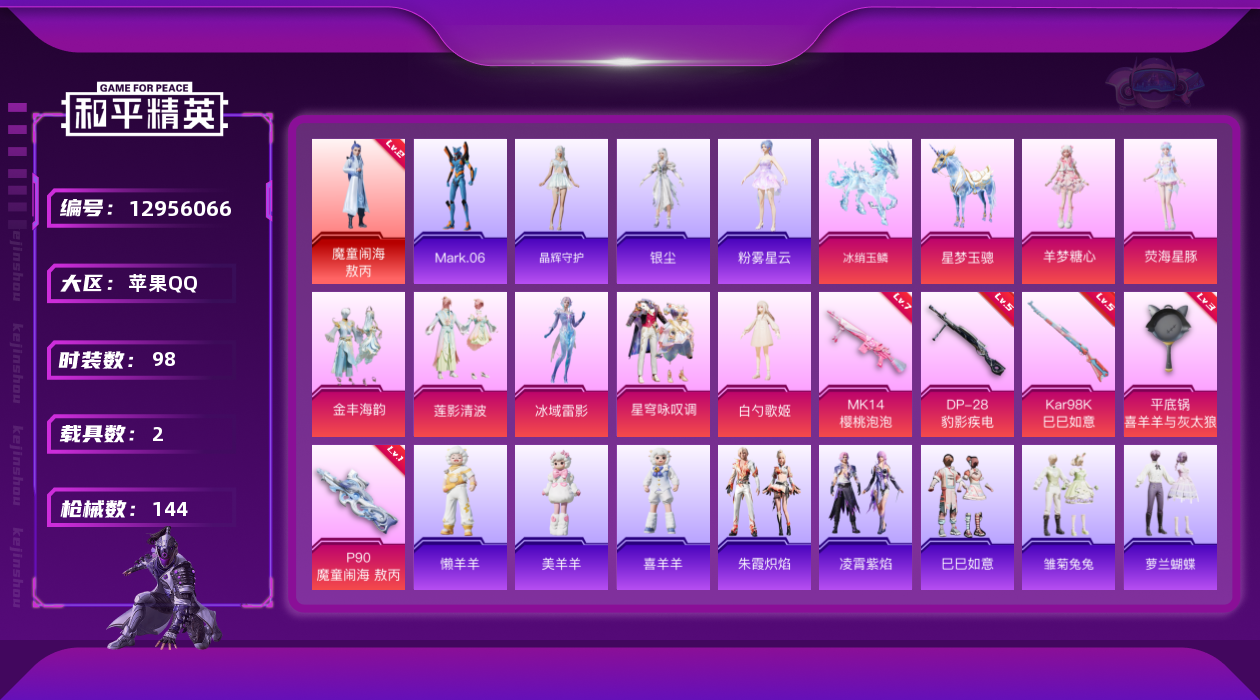 [12956066]素材身法号/绝世印记2 苹果 手Q-1神装-8粉装-5特效枪-2载具-4粉色飞行器-5w热力值-10王牌印记-98套装-144枪皮【红色神装等级】:魔童闹海-敖丙(二级)【热门品类】:角色-Mark.06【粉色载具】:星梦玉骢,冰绡玉鳞【粉色套装】:角色-白勺歌姬,粉装-莲影清波,角色-冰域雷影,粉装-金丰海韵,粉装-星穹咏叹调,角色-荧海星豚,角色-羊梦糖心【粉色枪皮等级】:P90-魔童闹海 敖丙(一级),Kar98K-巳巳如意(五级),Mk14-樱桃泡泡(七级),DP-28-豹影疾电(五级),平底锅-喜羊羊与灰太狼(三级)【粉色飞行器】:龙翔九天飞行器,飞天猪飞行器,灵珠游龙飞行器