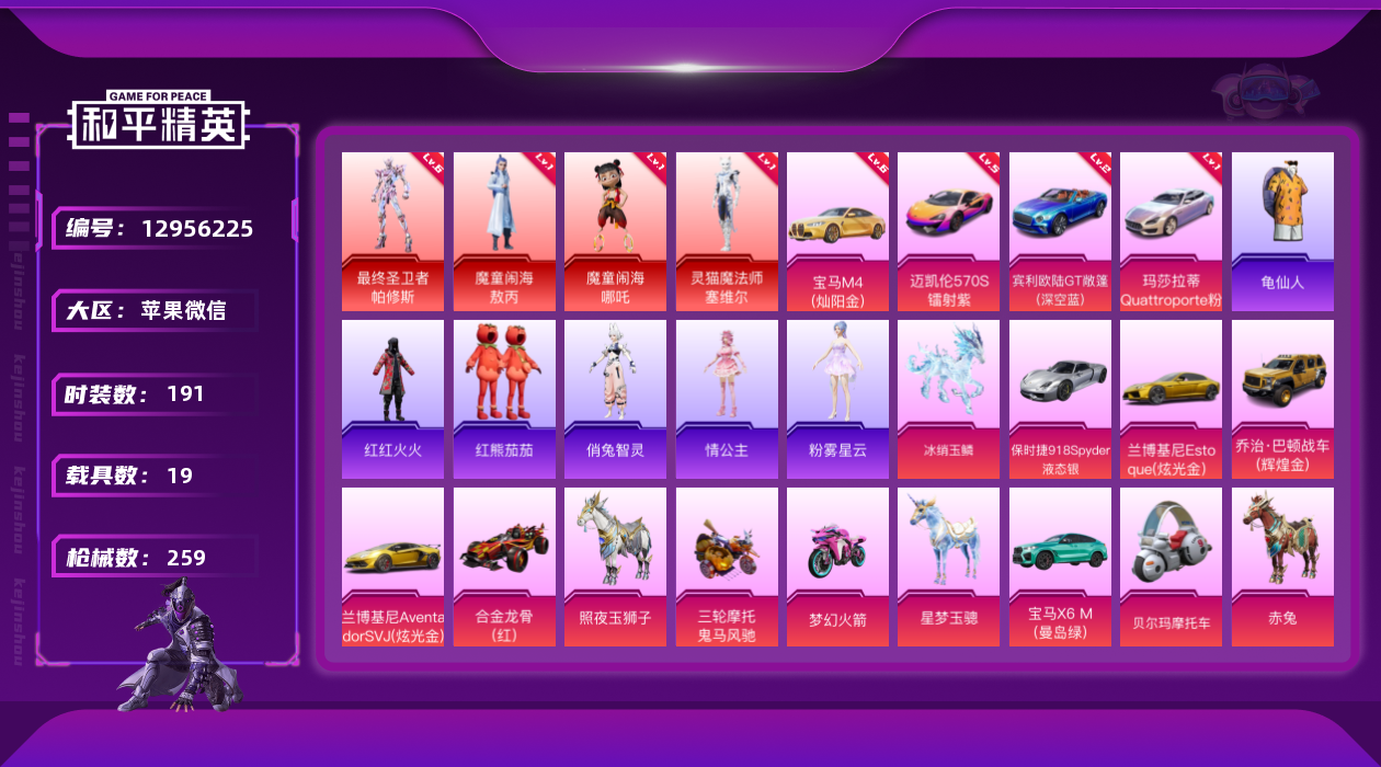 [12956225]素材身法号/4套6级红装可随意切换/5级迈凯伦570S/满6级宝马M4(灿阳金)/老101//璀璨碎片600 苹果 微信-4神装-48粉装-23特效枪-19载具-21粉色飞行器-15.9w热力值-10王牌印记-191套装-259枪皮【红色载具】:玛莎拉蒂Quattroporte(幻星粉)(一级),迈凯伦570S(镭射紫)(五级),宾利欧陆GT敞篷(深空蓝)(二级),宝马M4(灿阳金)(六级)【红色神装等级】:魔童闹海-敖丙(一级),魔童闹海-哪吒(一级),灵猫魔法师-塞维尔(一级),最终圣卫者-帕修斯(六级)【热门品类】:粉装-梦幻火箭,粉装-缤纷油彩,套装-火箭少女101,套装-深海小丑鱼,套装-胖达圆圆,套装-金羽特工,套装-AG追光队服,套装-AG战队服,角色-忠猛周仓,角色-忠真马岱,角色-忠义严颜,套装-龟仙人,套装-红红火火,大砍刀-青龙偃月刀,撬棍-龙胆亮银枪,套装-红熊茄茄【粉色载具】:兰博基尼Aventador SVJ(炫光金),兰博基尼Estoque(炫光金),玛莎拉蒂Quattroporte(幻星粉),乔治巴顿战车(辉煌金),宾利欧陆GT敞篷(深空蓝),宝马M4(灿阳金),宝马X6 M(曼岛绿),迈凯伦570S(镭射紫),保时捷918 Spyder(液态银),合金龙骨(红),双人摩托-梦幻火箭,布尔玛摩托车,鬼马风驰,赤兔,照夜玉狮子,星梦玉骢,黑曜夜骑,冰绡玉鳞【粉色套装】:粉装-甜心巧克力,粉装-宝贝奶油派,粉装-天使彩虹糖,粉装-金曜白虎,粉装-梦幻火箭,粉装-星之信仰,粉装-缤纷油彩,粉装-放客神游,粉装-新星烈龙,粉装-甜蜜誓约,粉装-诡面斩,粉装-冰霜白皇,粉装-炙焰红王,粉装-馨动时刻,粉装-虎啸骄阳,粉装-炙焰赤龙,粉装-飓风飞鹰,粉装-彩虹鹿灵,粉装-山涧鹿灵,角色-洛天依,粉装-甜心娃娃,粉装-精灵娃娃,粉装-酣梦娃娃,粉装-焦糖拿铁,粉装-恐龙拽拽,粉装-冷魅冰骑,粉装-赤焰黑爵,粉装-紫电风暴,粉装-圣光天使,角色-复仇流浪者,粉装-霓裳武神,粉装-盖世英雄,粉装-光明术士,粉装-霞光圣骑,粉装-寒光使者,粉装-第五大道,粉装-雪梅暗香,粉装-仲夏莫吉托,粉装-瑰丽时代,粉装-黄族统领,粉装-拂晓神骑,角色-万古烈焰,角色-宙之时溯,角色-星云暗核,角色-凤凰座 一辉,角色-冷漠罗丽,角色-罗征,角色-奇迹舞步 美琪
