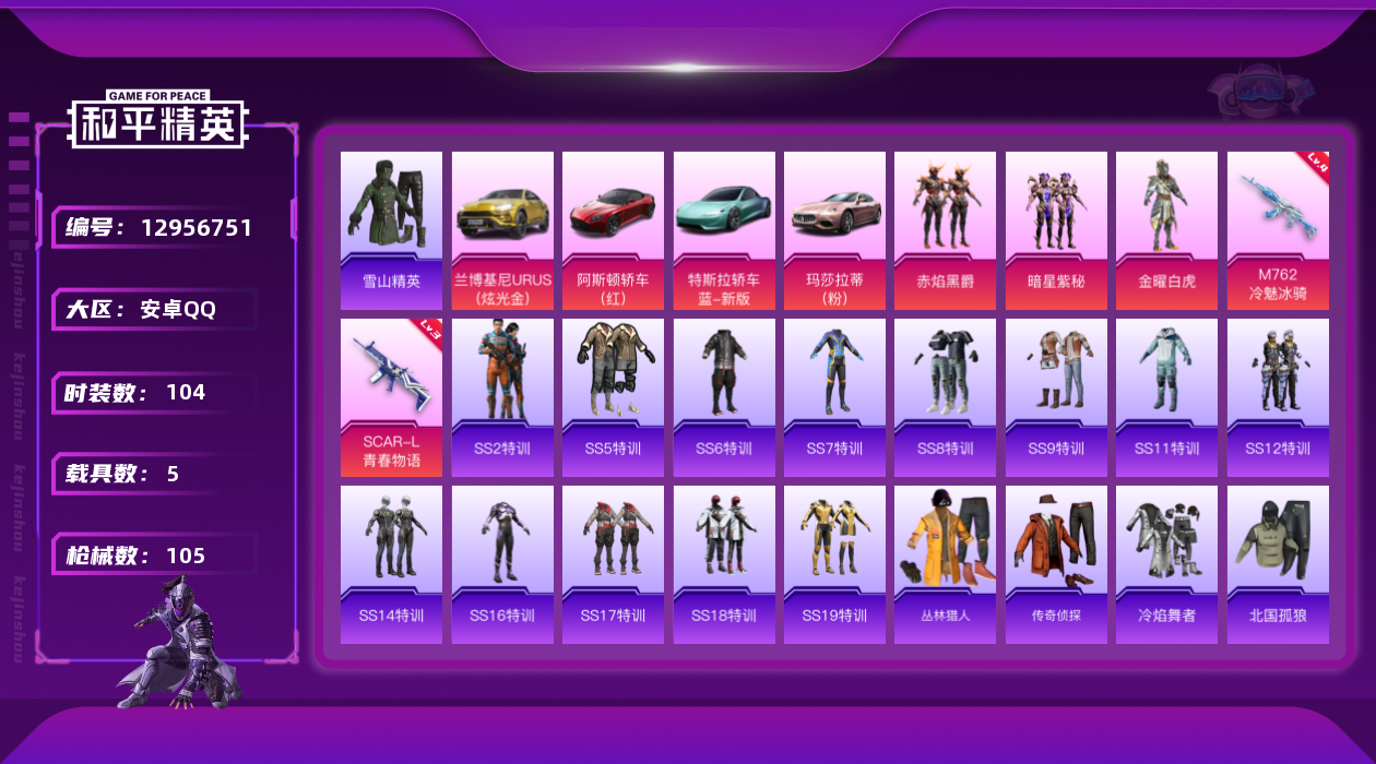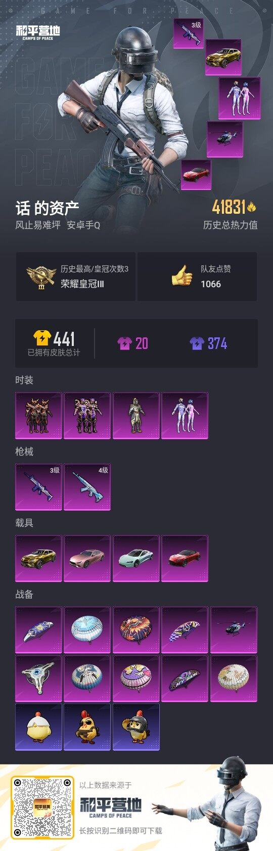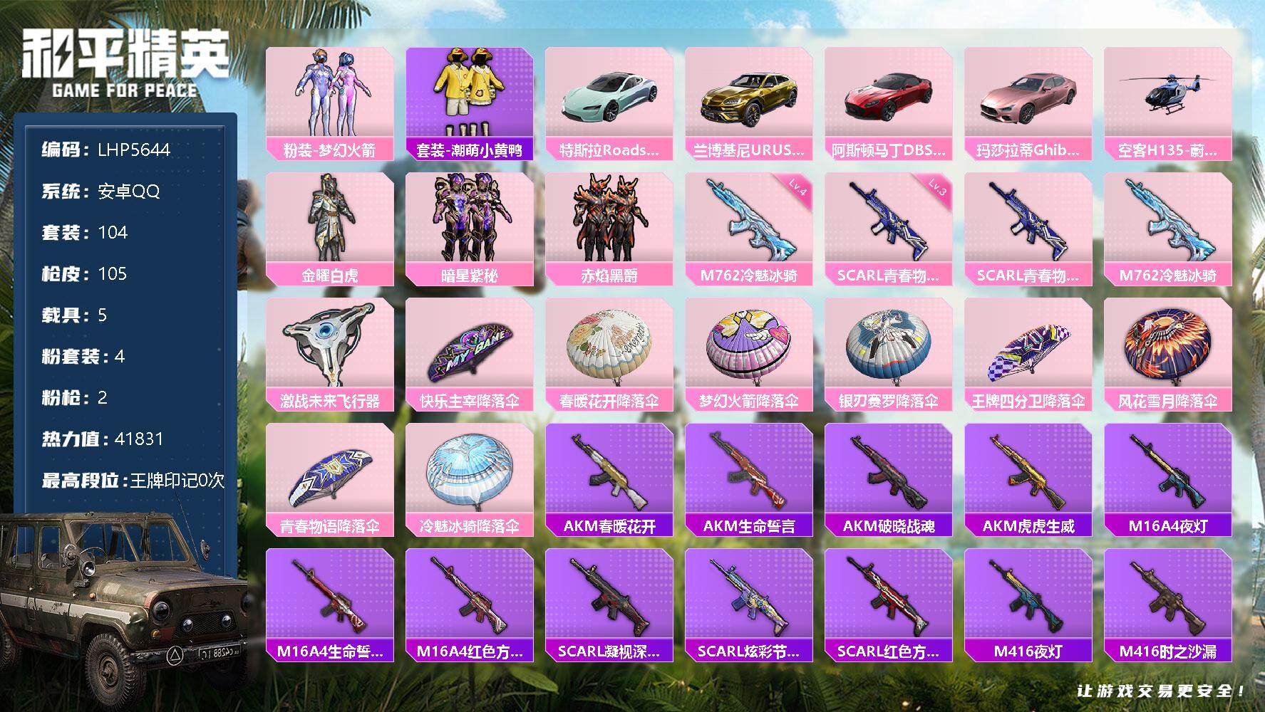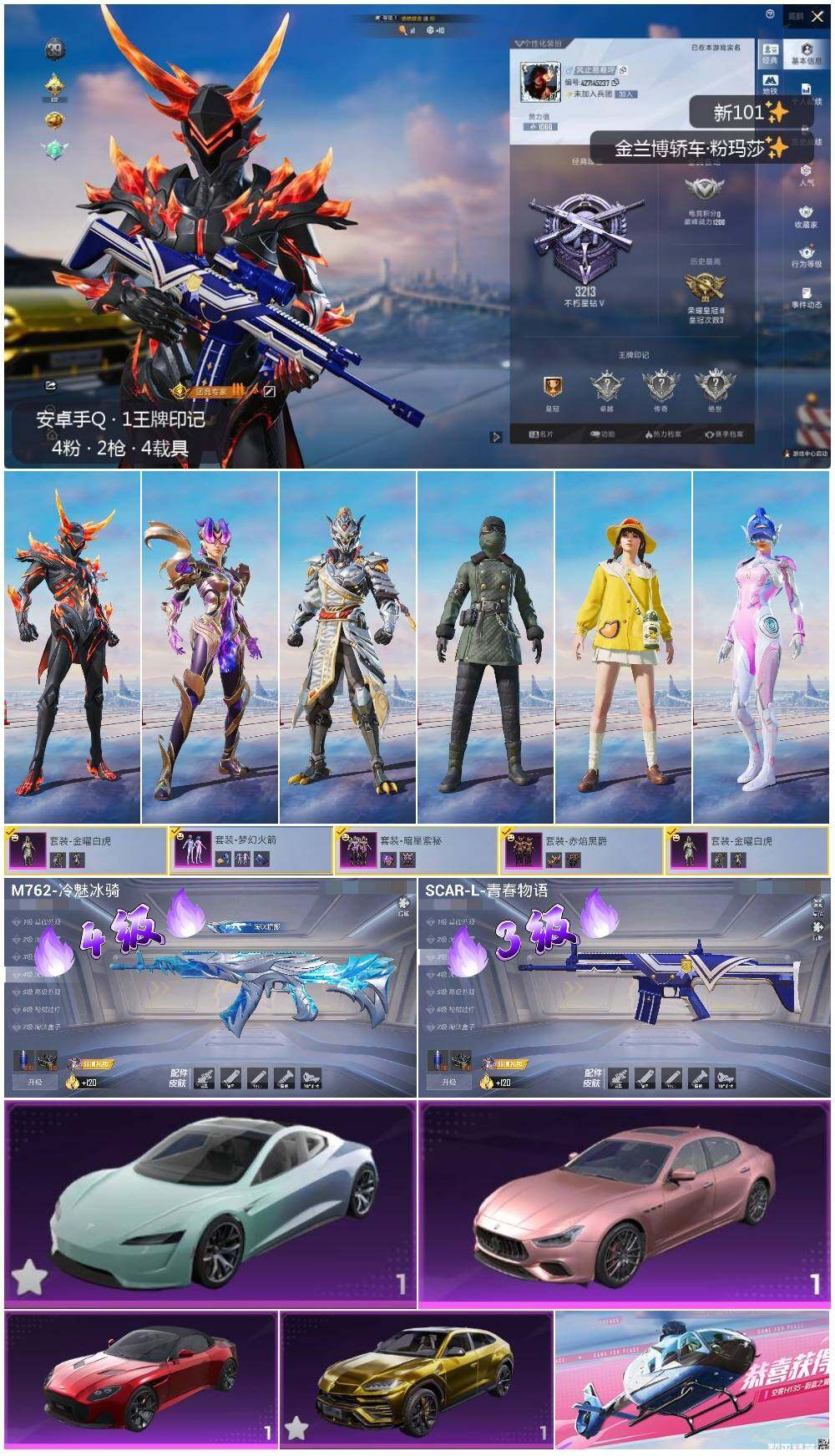[12956751]素材身法号 安卓 手Q-4粉装-2特效枪-5载具-1粉色飞行器-4.1w热力值-1王牌印记-104套装-105枪皮【热门品类】:粉装-梦幻火箭,套装-潮萌小黄鸭【粉色载具】:特斯拉Roadster(水滴蓝),兰博基尼URUS(炫光金),阿斯顿马丁DBS(红),玛莎拉蒂Ghibli(粉),空客H135-蔚蓝之翼【粉色套装】:粉装-金曜白虎,粉装-梦幻火箭,粉装-暗星紫秘,粉装-赤焰黑爵【粉色枪皮等级】:SCAR-L-青春物语(三级),M762-冷魅冰骑(四级)【粉色飞行器】:激战未来飞行器