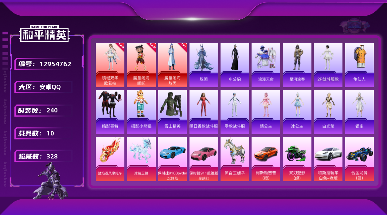 [12954762]素材身法号/镜域双华-欧若拉(四级)/绝世印记3/地铁满天赋【特价急出/详情看图】:安卓 手Q-3神装-22粉装-13特效枪-10载具-10粉色飞行器-12.8w热力值-20王牌印记-240套装-328枪皮【红色神装等级】:魔童闹海-敖丙(一级),魔童闹海-哪吒(二级),镜域双华-欧若拉(四级)【热门品类】:粉装-梦幻火箭,粉装-缤纷油彩,套装-浪漫天命,套装-小丑鱼,套装-奇异狩猎者,角色-军刀雅典娜,套装-星河浪客,角色-2P战斗服款,角色-忠真马岱,角色-忠义严颜,套装-龟仙人,套装-暗影哥特,套装-浪漫波比,套装-摄影小熊猫,大砍刀-青龙偃月刀,撬棍-龙胆亮银枪【粉色载具】:特斯拉Model 3(珍珠白),阿斯顿马丁DBX(橙),保时捷911 敞篷版(星珀红),保时捷918 Spyder(沉静蓝),合金龙骨(蓝),双人摩托-双刃魅影(绿),踏焰逐风摩托车,僚机-冰龙团团,照夜玉狮子,冰绡玉鳞【粉色套装】:粉装-极限特训,粉装-数码大师,粉装-宝贝奶油派,粉装-天使彩虹糖,粉装-梦幻火箭,粉装-缤纷油彩,粉装-新星烈龙,粉装-扶摇飞仙,粉装-幻彩马卡龙,粉装-草莓生巧,粉装-山涧鹿灵,角色-洛天依,角色-初号机款机体服,粉装-橘柚倾心,粉装-紫电风暴,粉装-灵感创作师,粉装-旋转彩虹,角色-呆萌星弥,角色-小可学妹,角色-美琪,角色-奇迹舞步 美雪,角色-羊梦糖心【粉色枪皮等级】:AKM-梦之光华(六级),M16A4-垂柳戏鸭(四级),SCAR-L-青春物语(五级),SCAR-L-锦绣绵绵(五级),SCAR-L-魔童闹海 哪吒(三级),M416-五爪金龙(二级),M416-心之恋语(七级),P90-魔童闹海 敖丙(三级),Kar98K-巳巳如意(五级),DP-28-豹影疾电(五级),MG3-梦幻舞会(五级),MG-36-沧焰双生(五级),平底锅-喜羊羊与灰太狼(一级)【粉色飞行器】:相思残雪飞行器,青春物语飞行器,拂晓神骑飞行器,小叽联名款飞行器,镜域双华-灵镜之阶,龙翔九天飞行器,万象金身飞行器,飞天猪飞行器,灵珠游龙飞行器