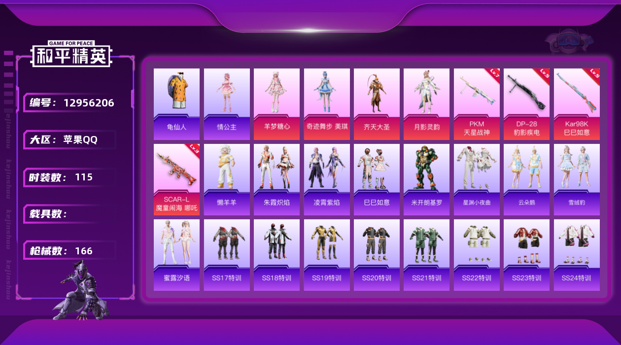 - PX_2094411- 可二次 苹果手Q-4王牌印记-9粉装-10特效枪-2载具-57818热力值-100套装-167枪皮-0卓越印记-0传奇印记, 【9粉装】,梦幻火箭,宝贝奶油派,洛天依,星穹咏叹调,时空协奏·心弦,千金淑猫,圣堂之誓,旋转彩虹,创世·救赎, 【10特效枪】,AKM-炫紫旋律-4级,SCAR-L-锦绣绵绵-5级,M416-心之恋语-7级,AUG-暖羊咩咩-4级,Kar98K-巳