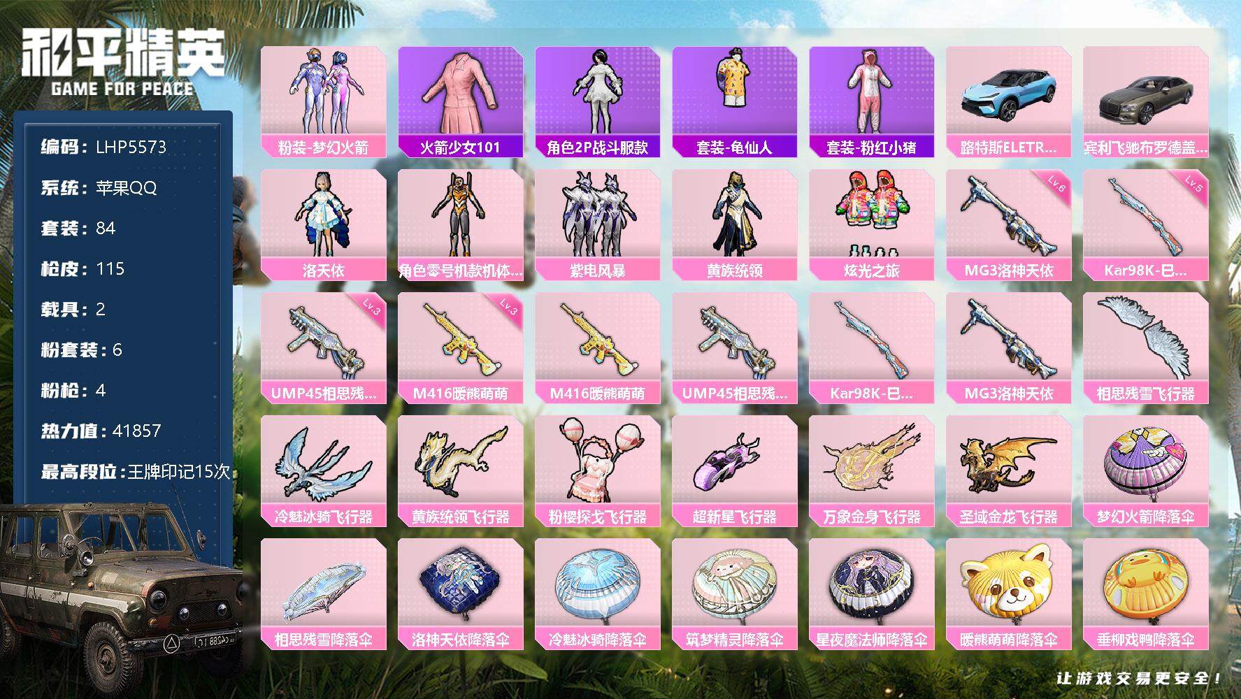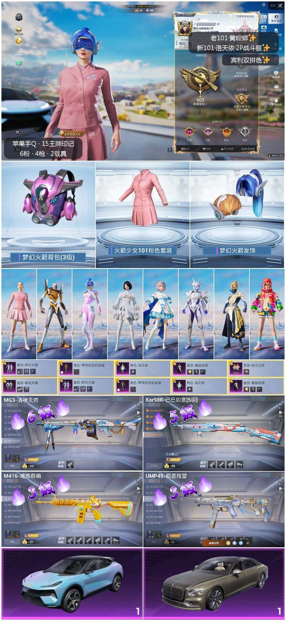 [12956255]素材身法号/老101 苹果 手Q-6粉装-4特效枪-2载具-7粉色飞行器-4.1w热力值-15王牌印记-84套装-115枪皮【热门品类】:粉装-梦幻火箭,套装-火箭少女101,角色-2P战斗服款,套装-龟仙人,套装-粉红小猪【粉色载具】:路特斯ELETRE(冰川蓝),宾利飞驰(布罗德盖棕双色)【粉色套装】:粉装-梦幻火箭,角色-洛天依,角色-零号机款机体服,粉装-紫电风暴,粉装-黄族统领,粉装-炫光之旅【粉色枪皮等级】:M416-暖熊萌萌(三级),UMP45-相思残雪(三级),Kar98K-巳巳如意(五级),MG3-洛神天依(六级)【粉色飞行器】:相思残雪飞行器,冷魅冰骑飞行器,黄族统领飞行器,粉樱探戈飞行器,超新星飞行器,万象金身飞行器,圣域金龙飞行器