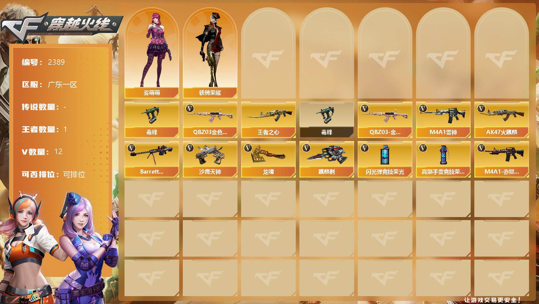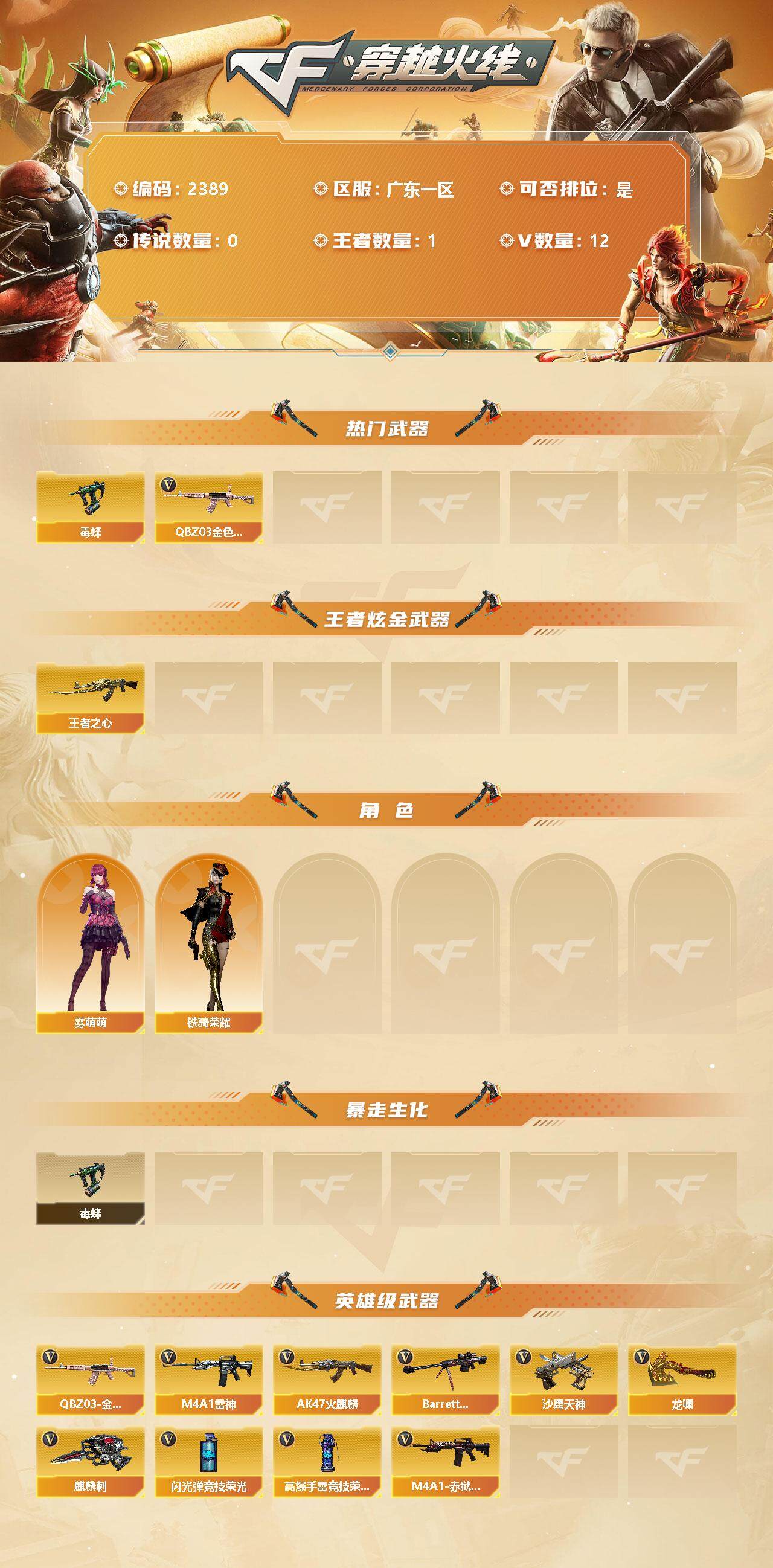 [12956373]广东一区-12V-1王者-0炫金 【热门武器】:QBZ03-金色蔷薇,毒蜂 【王者炫金武器】:王者之心 【角色】:雾萌萌,铁骑荣耀 【暴走生化】:毒蜂 【英雄级武器】:高爆手雷-竞技荣光,闪光弹-竞技荣光,QBZ03-金色蔷薇,M4A1-雷神*2,AK47-火麒麟*2,Barrett-毁灭,M4A1-赤狱骑士,沙鹰-天神,麒麟刺,龙啸 【特殊枪械】: