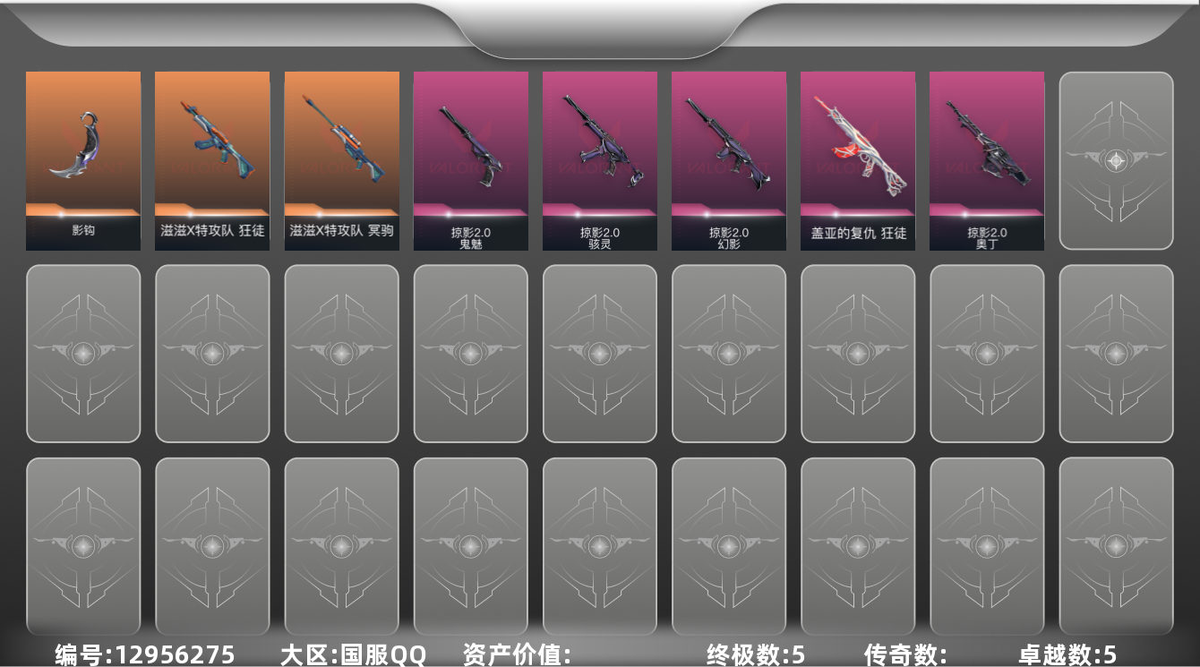 [12956275]【套装】:滋滋X特攻队套装,掠影//2.0套装 【英雄】:炼狱,壹决,捷风,雷兹,不死鸟,贤者,猎枭,零,芮娜,尚勃勒,夜露,盖可 【近战 武器】:近战武器-嘟昂嘟昂超弹力水球拳套,近战武器-影钩 【狂徒】:狂徒-滋滋X特攻队,狂徒-盖亚的复仇 【幻影】:幻影-掠影//2.0 【冥驹】:冥驹-滋滋X特攻队 【奥丁】:奥丁-掠影//2.0 【骇灵】:骇灵-掠影//2.0 【鬼魅】:鬼魅-掠影//2.0 【卡面】:树懒大作战 卡面,Clutch 卡面,无畏契约:尚勃勒 卡面,无畏契约GO!第一卷:芮娜 卡面,无畏契约GO!第一卷:零 卡面,《双城之战》金克丝 卡面,代号红色 卡面,新兵报到 卡面,V契约 卡面,无畏契约 卡面 【喷漆】:致命优雅 喷漆,霓光四射 喷漆,买装还是存钱 喷漆,关门放狗 喷漆,胜利属于无畏契约 喷漆,GLHF 喷漆,无畏契约 喷漆 【挂饰】:无畏契约GO!第一卷 芮娜 挂饰,无畏契约GO!第一卷 零 挂饰,天外飞客 挂饰,无畏契约 纪念币 挂饰