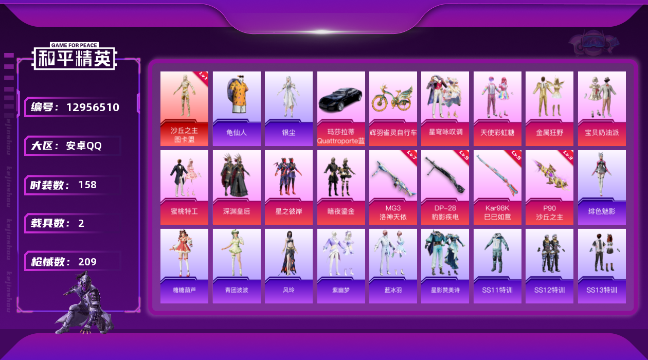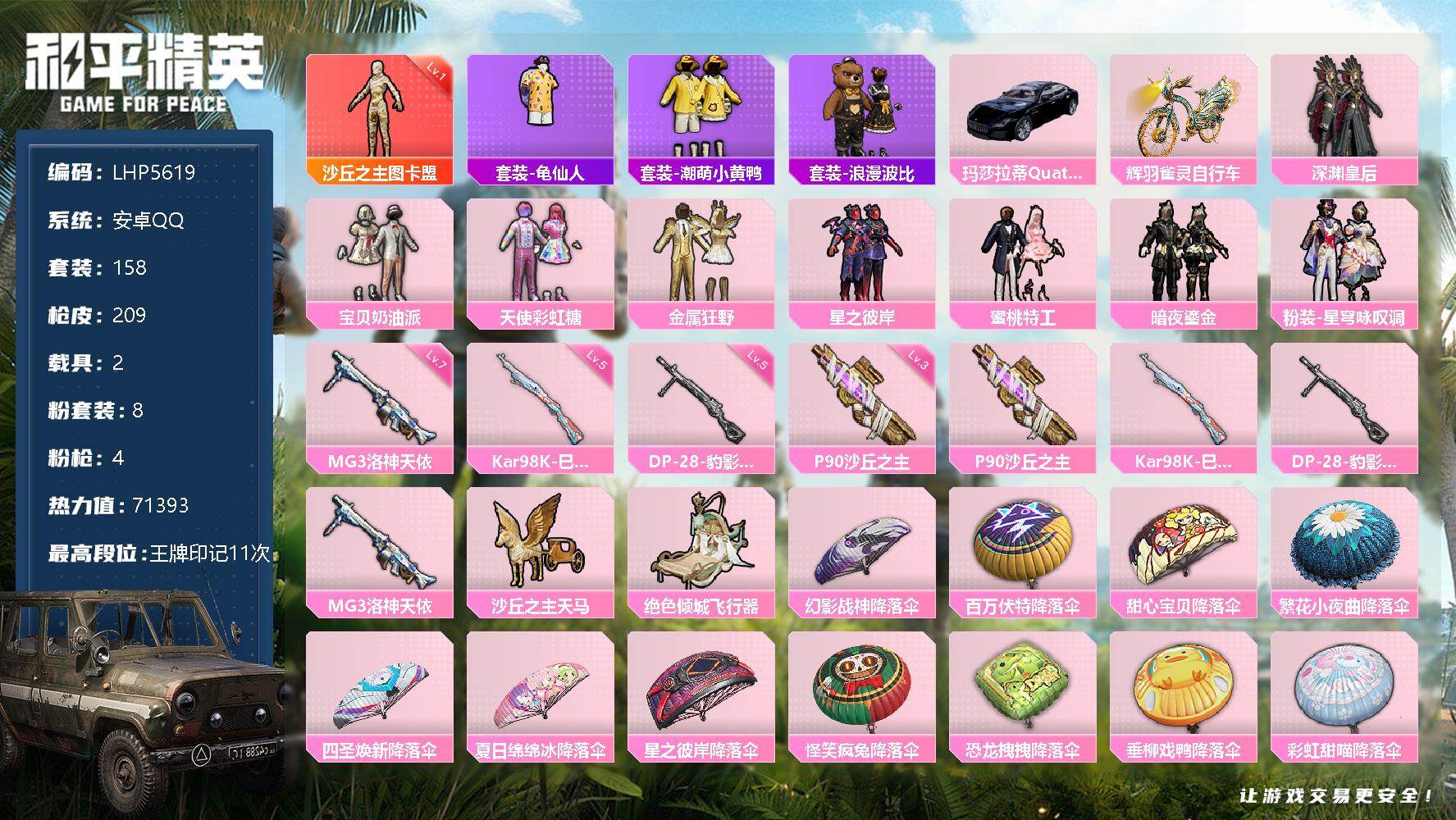[12956510]素材身法号/绝世印记1/地铁满天赋 安卓 手Q-1神装-8粉装-4特效枪-2载具-2粉色飞行器-7.1w热力值-11王牌印记-158套装-209枪皮【红色神装等级】:沙丘之主-图卡盟(一级)【热门品类】:套装-龟仙人,套装-潮萌小黄鸭,套装-浪漫波比【粉色载具】:玛莎拉蒂Quattroporte(夜幕蓝),辉羽雀灵自行车【粉色套装】:粉装-深渊皇后,粉装-宝贝奶油派,粉装-天使彩虹糖,粉装-金属狂野,粉装-星之彼岸,粉装-蜜桃特工,粉装-暗夜鎏金,粉装-星穹咏叹调【粉色枪皮等级】:P90-沙丘之主(三级),Kar98K-巳巳如意(五级),DP-28-豹影疾电(五级),MG3-洛神天依(七级)【粉色飞行器】:沙丘之主天马,绝色倾城飞行器