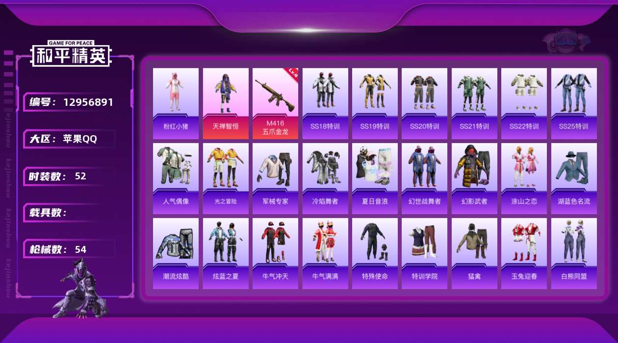 [12956891]苹果 手Q-1粉装-1特效枪-1.5w热力值-4王牌印记-52套装-54枪皮【热门品类】:套装-浪漫波比,套装-粉红小猪【粉色套装】:粉装-天禅智恒【粉色枪皮等级】:M416-五爪金龙(四级)