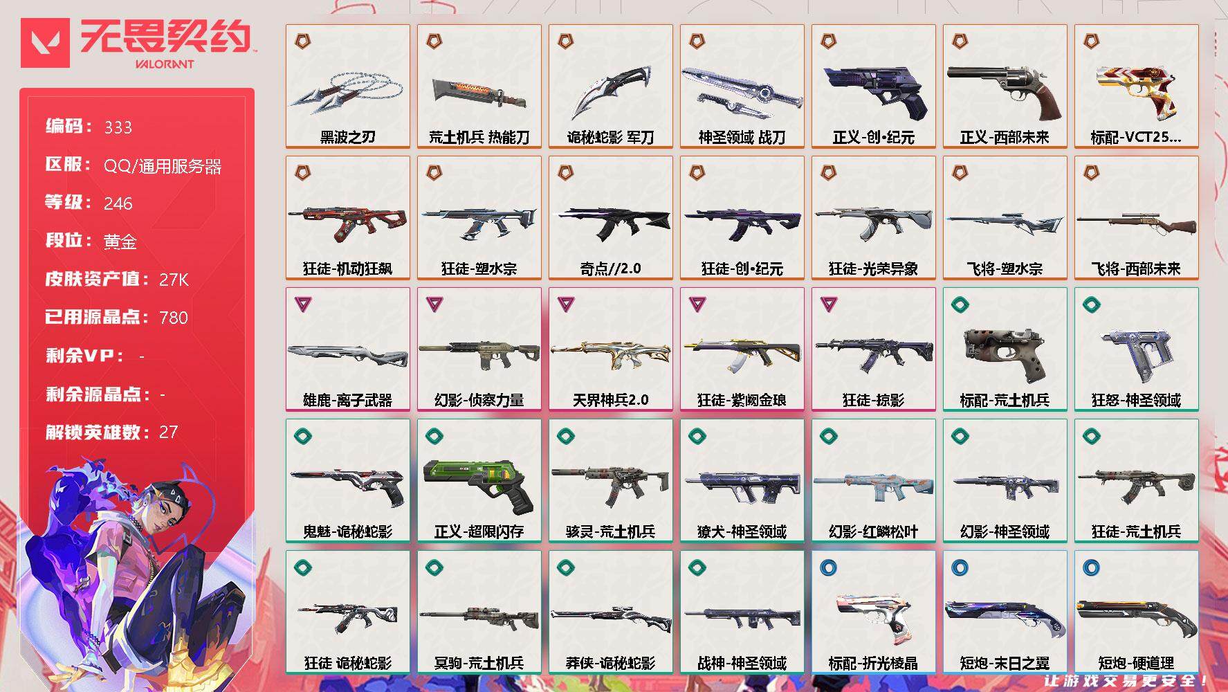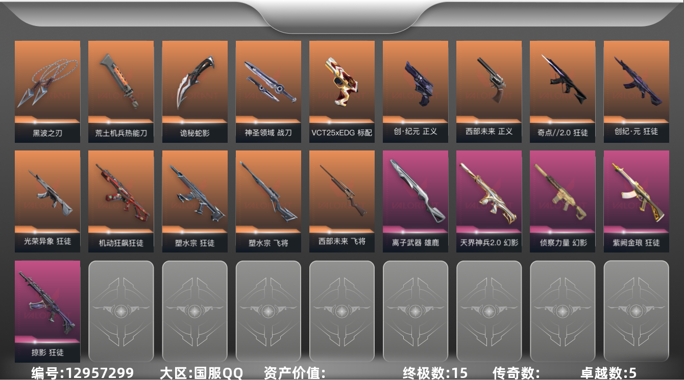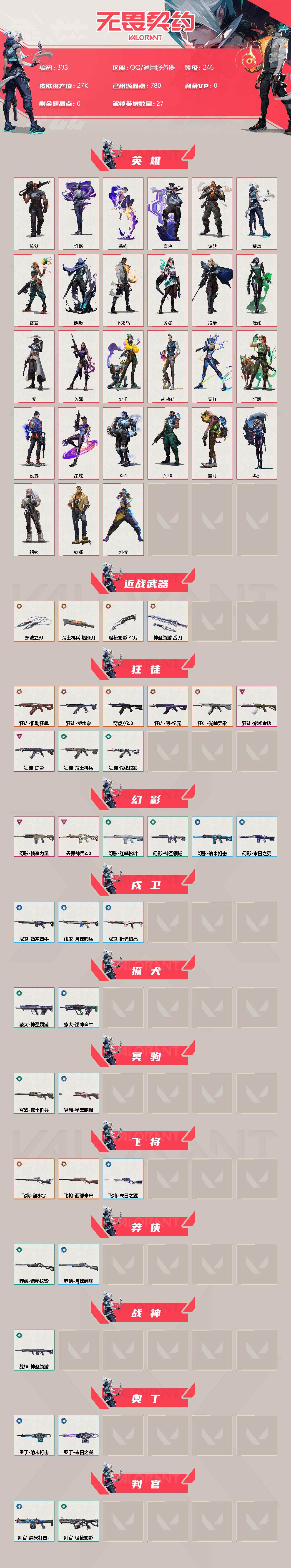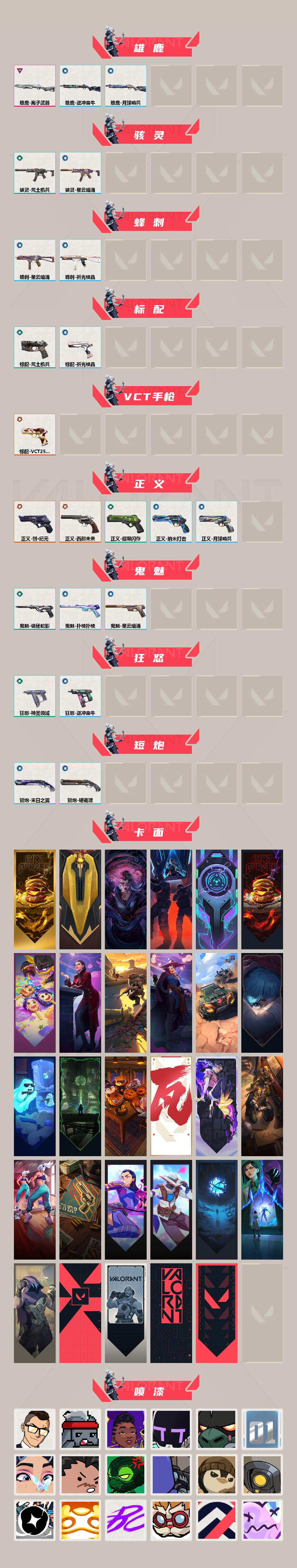 [12957299]【英雄】:幻棱,炼狱,维斯,暮蝶,钛狐,壹决,铁臂,捷风,雷兹,幽影,不死鸟,贤者,猎枭,蝰蛇,零,芮娜,奇乐,尚勃勒,霓虹,斯凯,夜露,星礈,K/O,海神,盖可,黑梦,钢锁 【近战 武器】:近战武器-黑波之刃,近战武器-荒土机兵 热能刀,近战武器-诡秘蛇影 军刀,近战武器-神圣领域 战刀 【狂徒】:狂徒-机动狂飙,狂徒-奇点//2.0,狂徒-塑水宗,狂徒-创·纪元,狂徒-光荣异象,狂徒-掠影,狂徒-紫阙金琅,狂徒-荒土机兵,狂徒-诡秘蛇影 【幻影】:幻影-天界神兵//2.0,幻影-侦察力量,幻影-红鳞松叶,幻影-神圣领域,幻影-纳米打击,幻影-末日之翼 【戍卫】:戍卫-逆冲蛮牛,戍卫-月球哨兵,戍卫-折光棱晶 【獠犬】:獠犬-神圣领域,獠犬-逆冲蛮牛 【冥驹】:冥驹-荒土机兵,冥驹-星云暗涌 【飞将】:飞将-塑水宗,飞将-西部未来,飞将-末日之翼 【莽侠】:莽侠-诡秘蛇影,莽侠-月球哨兵 【战神】:战神-神圣领域 【奥丁】:奥丁-纳米打击,奥丁-末日之翼 【判官】:判官-诡秘蛇影,判官-纳米打击x 【雄鹿】:雄鹿-离子武器,雄鹿-逆冲蛮牛,雄鹿-月球哨兵 【骇灵】:骇灵-荒土机兵,骇灵-星云暗涌 【蜂刺】:蜂刺-星云暗涌,蜂刺-折光棱晶 【标配】:标配-荒土机兵,标配-折光棱晶 【VCT手枪】:标配-VCT25 x EDG 【正义】:正义-创·纪元,正义-西部未来,正义-超限闪存,正义-纳米打击,正义-月球哨兵 【鬼魅】:鬼魅-诡秘蛇影,鬼魅-扑棱扑棱,鬼魅-星云暗涌 【狂怒】:狂怒-神圣领域,狂怒-逆冲蛮牛 【短炮】:短炮-末日之翼,短炮-硬道理 【卡面】:终章:激斗汉堡 卡面,进入射程 卡面,分崩离析 卡面,纳米打击 卡面,抑制技术 卡面,激斗汉堡 卡面,瓦娃脸雪糕 P2 卡面,从黄昏到黎明 卡面,荒土机兵 卡面,银弹猎手 卡面,逆冲蛮牛 卡面,《双城之战》拥抱 卡面,精灵大战 卡面,欢迎来到底城 卡面,南瓜盛典 卡面,VCT CN首冠 卡面,无畏契约:暮蝶 卡面,修车达人 卡面,热舞环节 卡面,正义的化身 卡面,无畏契约GO!第一卷:芮娜 卡面,无畏契约GO!第一卷:零 卡面,无垠星环 卡面,蝰蛇vs幽影 卡面,黑影先生的咖啡! 卡面,代号红色 卡面,新兵报到 卡面,V契约 卡面,无畏契约 卡面 【喷漆】:小小心意 喷漆,战“素”兔 喷漆,宇宙的指引 喷漆