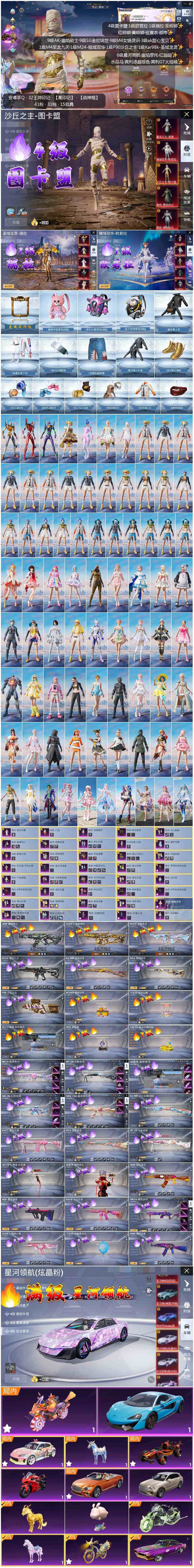 - [11884127]4粉装 5特效枪 1载具 14印记 可二次 可修改实名 女号 优质装备:玛莎拉蒂Ghibli(粉),梦幻火箭(新101)(新火箭少女101粉色套装),AKM梦之光华,洛天依,SCAR-L青春物语,GROZA旋转彩虹,M416超新星,七级GROZA-旋转彩虹,月影灵韵,Kar98K-巳巳如意 热门装扮:天星战神,迅捷狂鲨 六级特效枪:六级AKM-梦之光华,六级SCAR-L-青春物语 五级特效枪:五级Kar98K-巳巳如意 三级特效枪:三级M416-超新星 紫色装扮:SS22特训,香榭午后,娇憨猪猪,萌趣咩咩,暖心熊熊,SS21特训,SS31特训套装,千禧之恋,SS30特训套装,SS33特训套装,青涩时光,SS20特训,快乐星愿,星梦畅游,SS19特训,覆海蛟龙,SS17特训,沁蓝冰爽,SS18特训,长空猛禽,霓虹街区,缤纷果语,耀眼新星,花园小羊咩,荣耀,虎虎生威吉莉,飞行日记,魅力单车,麻辣教官,黄色名流,黎明保卫者,黑色伏地魔,龙的传人,龟仙人,香桃花海,格斗先锋,夏日音浪,幻世战舞者,探宝勇士,湖蓝色名流,绮丽涂鸦,甜蜜菠萝,破蛋小黄鸡,甜蜜告白,福星高照,空岛之星,空投萌叽,牛气冲天,灰色格斗者,炫蓝之夏,牛气满满,猛禽,SS29特训,拉斐尔,星途旅人,SS28特训,卖崽青蛙,玉兔迎春,竞技名士,怀庆长公主,银尘,情公主,果汁能量,2P战斗服款,惊鸿侠骨,神气柴柴,懵萌河马,SS24特训(SS24特训套装),SS25特训,绝对偶像,锦衣飞扬,焰鹰斗篷,幻羽潜行,幽夜迷踪,SS27特训,无暇誓言,明鸳圣池,日照花林,SS26特训,春光漫游,快闪甜心,贝斯之夜,朱雀圣者,暗夜契约,SS32特训服(SS32特训套装),绯格组合,恋语绒绒,光之冒险 优质战备:圣堂之誓降落伞,精灵梦叶罗丽降落伞,镜光幻境降落伞,恐龙拽拽降落伞,星之彼岸降落伞,镜域双华-灵镜之阶,智耀战神降落伞,彩虹甜喵降落伞,垂柳戏鸭降落伞,炫光之旅降落伞,梦幻火箭降落伞,神秘黑猫降落伞,洛神天依降落伞