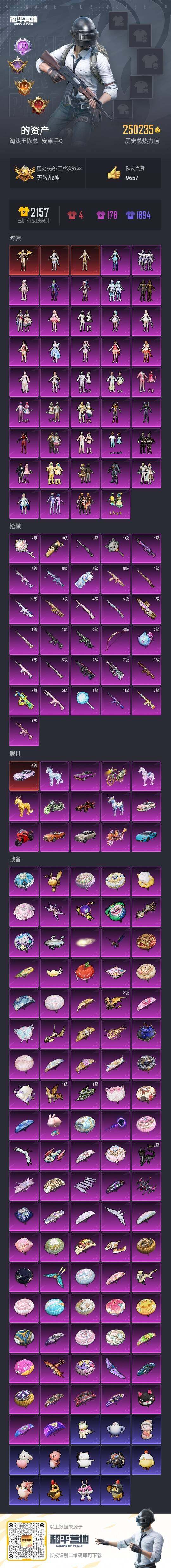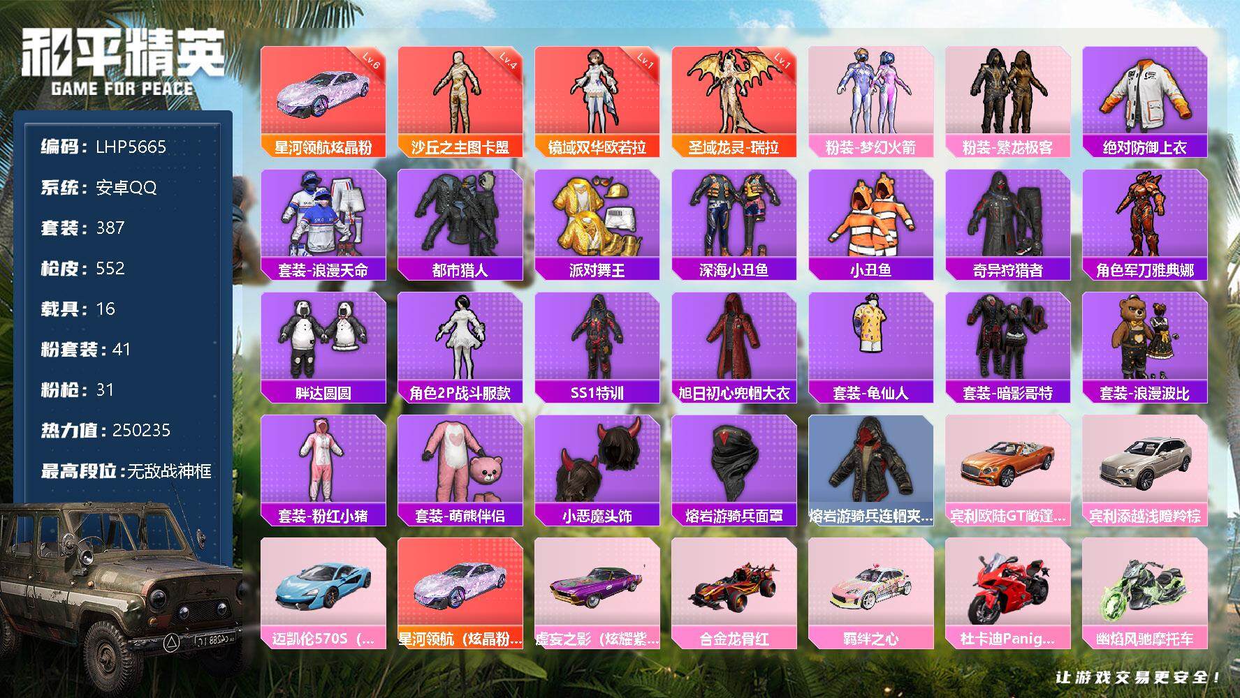 - [12168966]2粉装 3特效枪 2载具 2印记 可二次 可修改实名 优质装备:合金龙骨(蓝),特斯拉Roadster(水滴蓝),绚金战神,洛天依,UMP45量子极限,Kar98K-巳巳如意 热门装扮:软萌银虎,东方飞龙,好奇恐龙 稀有枪皮:DP-28-豹影疾电 五级特效枪:五级UMP45-量子极限,五级Kar98K-巳巳如意 四级特效枪:四级DP-28-豹影疾电 紫色装扮:田园牧歌,轻风白浪,SS22特训,照水倚天,娇憨猪猪,萌趣咩咩,SS21特训,SS31特训套装,冰川特警,冷焰舞者,千禧之恋,SS33特训套装,顶瓜瓜,SS15特训,时空追击者,暴风机械师,SS16特训,冰爽风暴,爆裂葡萄,冰爽海盐,SS13特训,击剑大师,诡谋托雷基亚,治愈之星,迅捷之星,科技之星,SS14特训,萌趣颜团子,SS19特训,SS17特训,异彩先驱,SS18特训,都市漫游者,都市魅力,酷萌兔限定,长空猛禽,霓虹极客,霓虹街区,青年教官,迎春赐吉,缤纷果语,蓝彩潮人,蓝色运动,街头潮人,骑行爱好者,魅力单车,鹤鸣,麻辣教官,黄色名流,黄色运动,黑色伏地魔,龙魂突击队,棕色飞行服,海岛探路者,清新柠檬,幻影武者,夏日音浪,幻世战舞者,登山爱好者,白熊同盟,破晓战魂,破蛋小黄鸡,游猎者,空投萌叽,竞技达人朋克,猛禽,达芬奇,纯真浪花,热情海星,SS28特训,卖崽青蛙,冰公主,鱼渊荷华,燕燕于飞,巳巳如意,竞技名士,焰鹰斗篷,幻羽潜行,SS27特训,智谋强哥,晶辉守护,薄荷蓝莓,SS11特训,耀粉歌者,SS32特训服(SS32特训套装),萌黄之夏,海上生明月 优质战备:精灵梦叶罗丽降落伞,星空武士降落伞,晶梦幻蝶降落伞,鬼刀降落伞,神秘黑猫降落伞,荧光虫舞降落伞,香水柠檬降落伞,梦之光华降落伞,暗星紫秘降落伞