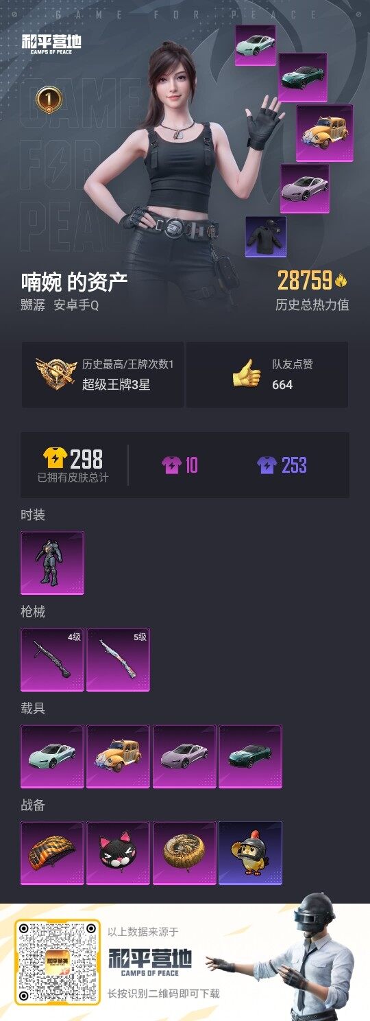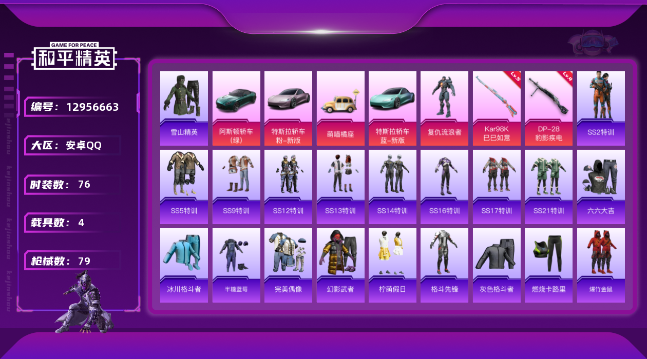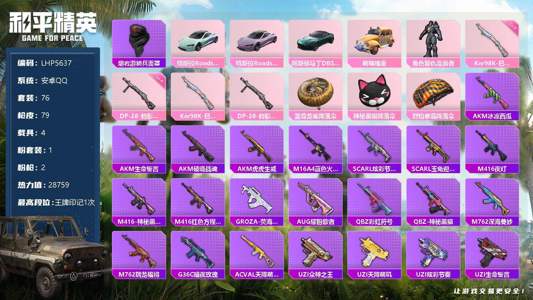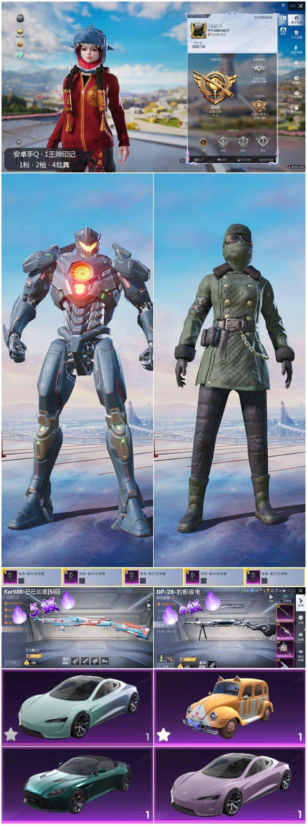 [12956663]安卓 手Q-1粉装-2特效枪-4载具-2.8w热力值-1王牌印记-76套装-79枪皮【热门品类】:熔岩游骑兵面罩【粉色载具】:特斯拉Roadster(水滴蓝),特斯拉Roadster(沁心粉),阿斯顿马丁DBS(绿),萌喵橘座【粉色套装】:角色-复仇流浪者【粉色枪皮等级】:Kar98K-巳巳如意(五级),DP-28-豹影疾电(四级)