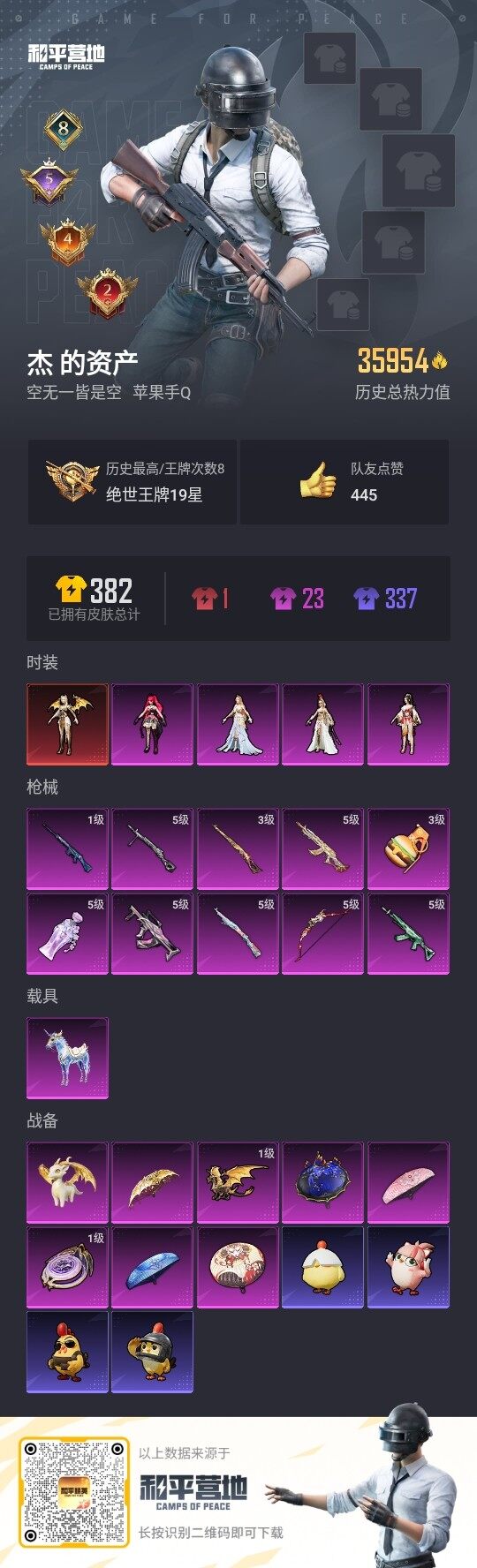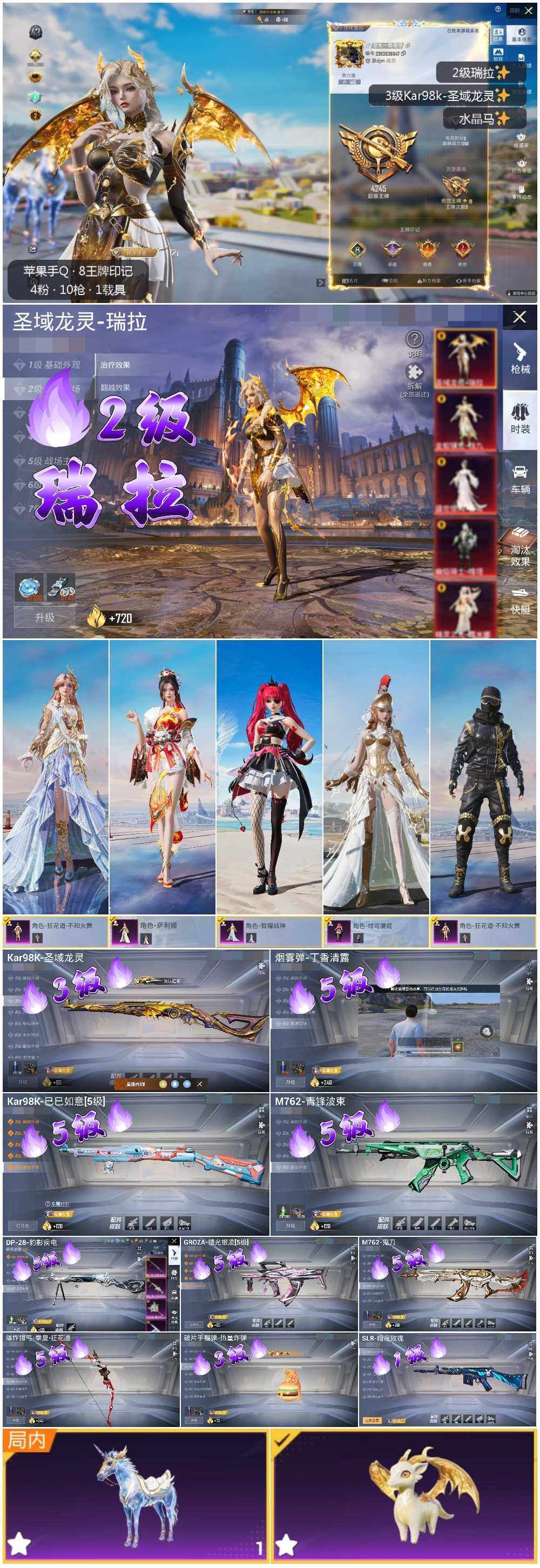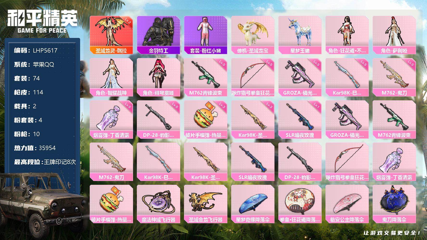 [12956495]素材身法号/绝世印记2 苹果 手Q-1神装-4粉装-10特效枪-2载具-2粉色飞行器-3.5w热力值-8王牌印记-74套装-114枪皮【红色神装等级】:圣域龙灵-瑞拉(二级)【热门品类】:套装-金羽特工,套装-粉红小猪【粉色载具】:僚机-圣域龙宝,星梦玉骢【粉色套装】:角色-狂花道·不知火舞,角色-萨利娅,角色-智耀战神,角色-绯穹魔姬【粉色枪皮等级】:GROZA-镜光银凌(五级),M762-青锋波束(五级),M762-鬼刀(五级),Kar98K-巳巳如意(五级),Kar98K-圣域龙灵(三级),SLR-暗夜玫瑰(一级),DP-28-豹影疾电(五级),爆炸猎弓-拳皇·狂花道(五级),烟雾弹-丁香清露(五级),破片手榴弹-热量炸弹(三级)【粉色飞行器】:魔法神域飞行器,圣域金龙飞行器