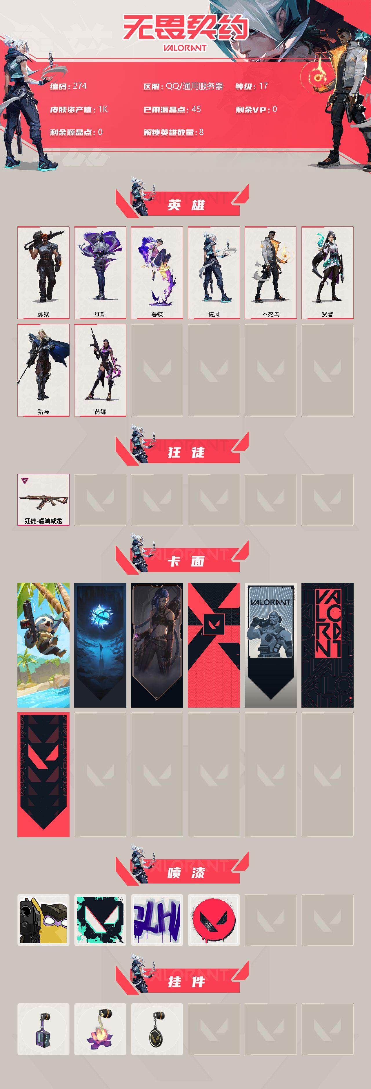 [12956535]【英雄】:炼狱,维斯,暮蝶,捷风,不死鸟,贤者,猎枭,芮娜 【狂徒】:狂徒-耀鳞威龙 【卡面】:树懒大作战 卡面,无垠星环 卡面,《双城之战》金克丝 卡面,代号红色 卡面,新兵报到 卡面,V契约 卡面,无畏契约 卡面 【喷漆】:放下武器 喷漆,胜利属于无畏契约 喷漆,GLHF 喷漆,无畏契约 喷漆 【挂饰】:动力机箱 挂饰,传世莲华 挂饰,无畏契约 纪念币 挂饰