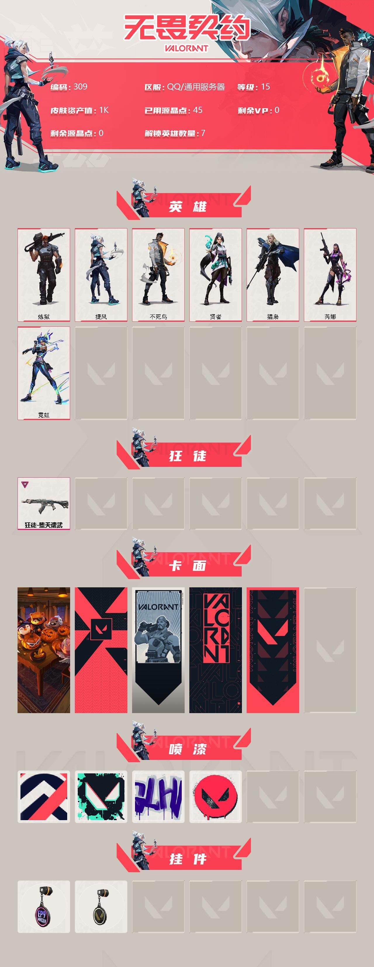 [12956743]【英雄】:炼狱,捷风,不死鸟,贤者,猎枭,芮娜,霓虹 【狂徒】:狂徒-堕天遗武 【卡面】:南瓜盛典 卡面,代号红色 卡面,新兵报到 卡面,V契约 卡面,无畏契约 卡面 【喷漆】:控场勿近 喷漆,胜利属于无畏契约 喷漆,GLHF 喷漆,无畏契约 喷漆 【挂饰】:第九季//第三幕 纪念币 挂饰,无畏契约 纪念币 挂饰