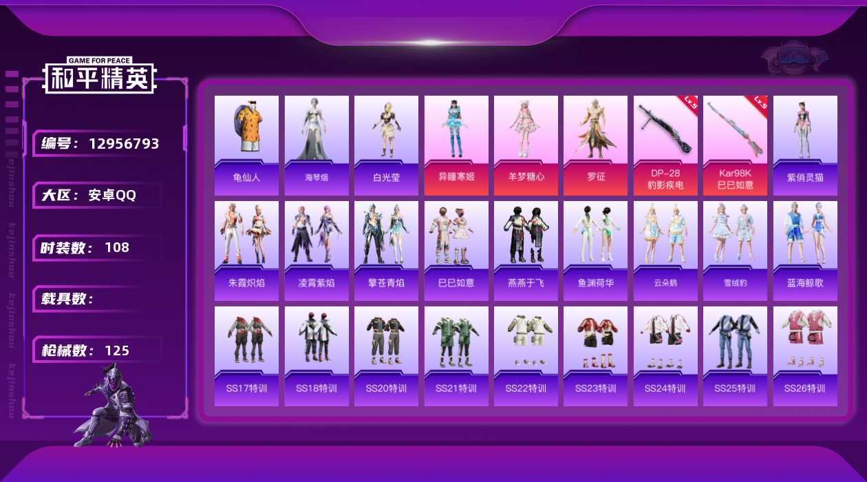 [12956793]地铁满天赋 安卓 手Q-3粉装-2特效枪-3.5w热力值-5王牌印记-108套装-125枪皮【热门品类】:套装-龟仙人【粉色套装】:角色-罗征,角色-羊梦糖心,角色-异瞳寒姬【粉色枪皮等级】:Kar98K-巳巳如意(五级),DP-28-豹影疾电(五级)