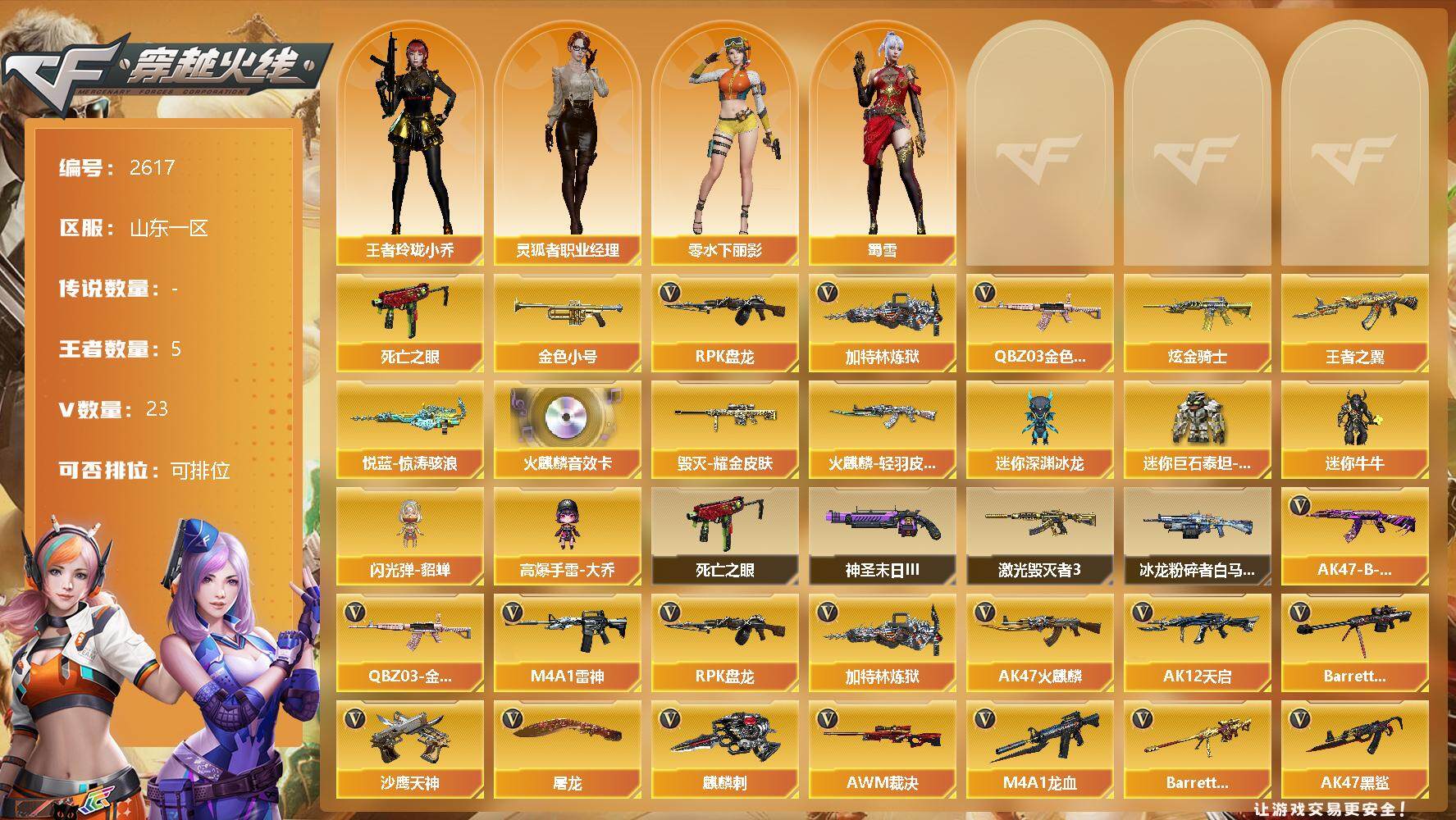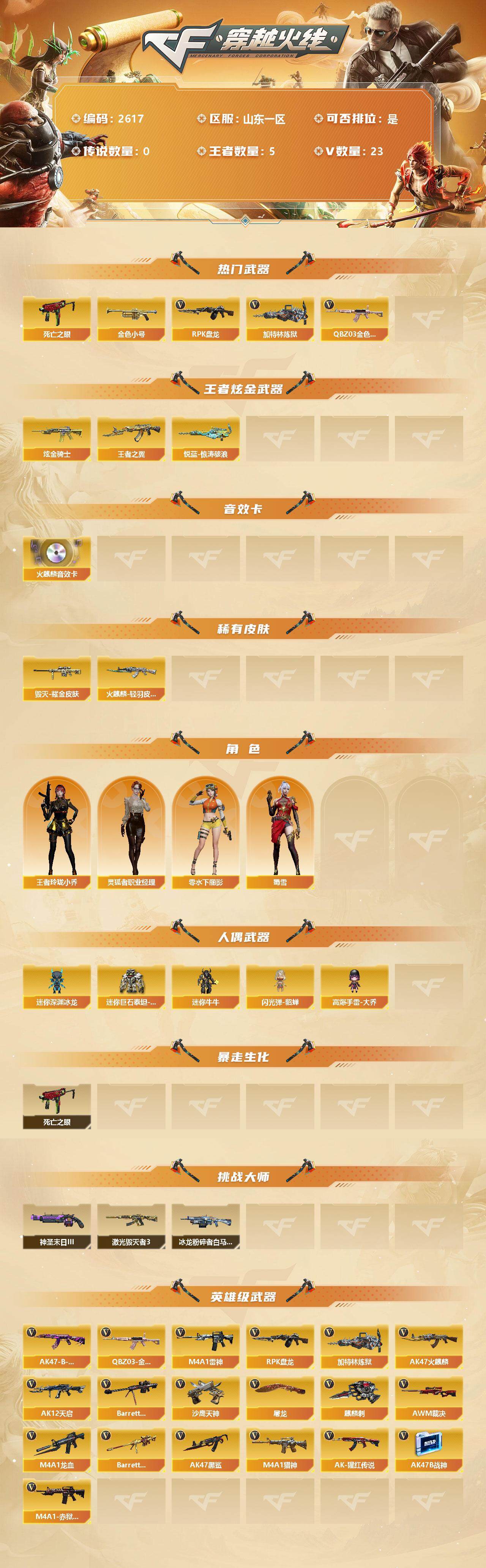 [12957559]山东一区-23V-5王者-1炫金 【热门武器】:QBZ03-金色蔷薇,死亡之眼,金色小号,RPK-盘龙,加特林-炼狱 【王者炫金武器】:炫金骑士,王者之翼,悦蓝-惊涛骇浪 【音效卡】:AK47-火麒麟音效卡 【稀有皮肤】:火麒麟-轻羽皮肤,毁灭耀金皮肤 【角色】:王者玲珑-小乔,灵狐者-职业经理,零-水下丽影,蜀雪 【人偶武器】:迷你深渊冰龙*2,迷你巨石泰坦-魔花研究所,迷你牛牛,闪光弹-貂蝉,高爆手雷-大乔 【暴走生化】:死亡之眼 【挑战大师】:神圣爆裂者-末日III,激光毁灭者III,冰龙粉碎者-白马银枪*2 【英雄级武器】:QBZ03-金色蔷薇,M4A1-雷神,RPK-盘龙,加特林-炼狱,AK47-火麒麟*2,AK12-天启,Barrett-毁灭,AWM-裁决,M4A1-龙血,Barrett-朱雀,AK47-黑鲨,M4A1-猎神,AK-47-猩红传说,AK47-B-战神,AK47-B-常胜将军,M4A1-赤狱骑士,沙鹰-天神,麒麟刺,屠龙 【特殊枪械】:1盘龙,1炼狱