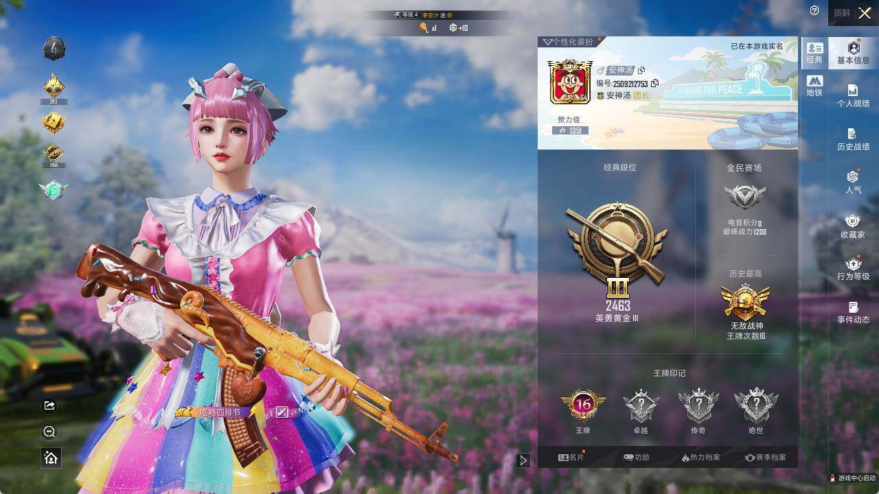 - [12147620]5粉装 2特效枪 1载具 10印记 可二次 可修改实名 战神框 身法装备:都市猎人 优质装备:Formula E Gen2(幽光蓝),都市猎人,M416五爪金龙,深渊皇后,七级M416-五爪金龙,Kar98K-巳巳如意 热门装扮:俏雪含霜,吟月归客,暗夜玫瑰,圣堂之誓,迅捷狂鲨,鹰眼刺客,梦魇先生,浪漫波比,都市猎人,星兔领航员 五级特效枪:五级Kar98K-巳巳如意 紫色装扮:SS31特训套装,SS30特训套装,SS23特训,SS33特训套装,幻彩翩翩,碧波幻想,田园牧歌,轻风白浪,和煦暖阳,SS22特训,摩登艾咪,妙红点点,吉莉礼服,夏日音浪,幻世战舞者,冷焰舞者,六六大吉,军械专家,冰川特警,SS21特训,时空追击者,暴风机械师,SS16特训,龙宫之主,遗落祭司,欧布奥特曼,电音精灵,瑞龙福将,团圆交子,SS17特训,星梦畅游,治愈之星,迅捷之星,科技之星,SS14特训,萌趣颜团子,特种颜团子,青春冒险家,光影梦想家,潮流游乐家,SS15特训,蝎王蛇后,甜心亚梦,虚音幻奏,猎梦纪元,SS20特训,竞技角斗士,娇憨猪猪,萌趣咩咩,异彩先驱,缤纷焰火,SS18特训,水晶王族,雪兔飞飞,飞驰魅影,音速流光,SS19特训,军刀雅典娜,风行保卫者,魅力单车,鹤鸣,麻辣教官,黄色伏地魔,黄色运动,青春校园,龙的传人,龟仙人,龙魂突击队,香桃花海,野性战心,迎春赐吉,长空猛禽,雨林探路者,霓虹极客,霓虹街区,超能勇士,湖蓝色名流,滨海假日,滨海厨神,潮流先锋,炫蓝之夏,热血青春,燃烧卡路里,牛气冲天,牛气满满,探宝勇士,朋克治安官,极地朋克,柠萌假日,海岛探路者,格斗先锋,沙漠兵团,沙漠毒蛇,特战装甲,绮丽涂鸦,缤纷果语,耀眼新星,蓝色运动,虎虎生威吉莉,登山爱好者,王牌教练,甜蜜熊情侣,甜蜜菠萝,白色伏地魔,破晓战魂,福星高照,空岛之星,空投萌叽,突袭者,SS28特训,玉兔迎春,智谋强哥,竞技名士,绒宝小鹅,惊鸿侠骨,SS24特训(SS24特训套装),SS25特训,锦衣飞扬,SS27特训,Alan Walker,蝶吟花词,明鸳圣池,浪漫天命,SS26特训,薄荷蓝莓,银白舞王,击剑大师,超能拳王,绯格组合,萌黄之夏,SS32特训服(SS32特训套装),光之冒险,恋语绒绒,漫步者,冰冻风暴,海上生明月 优质战备:江南烟雨降落伞,海螺星光降落伞,甜心宝贝降落伞,夏