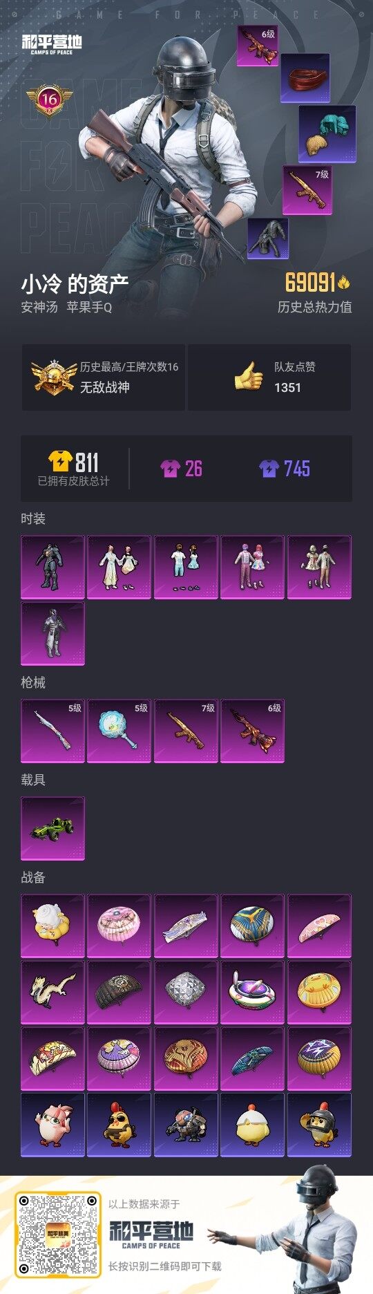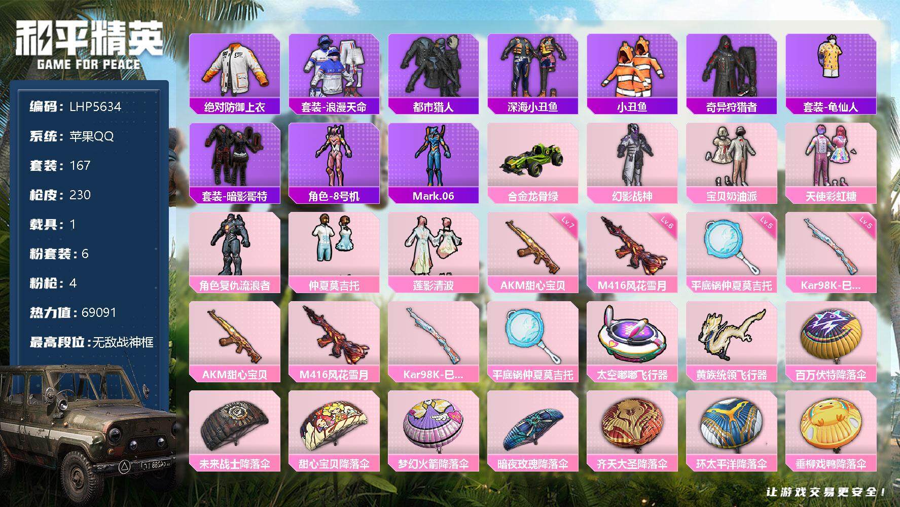 [12956636]素材身法号/无敌战神框1 苹果 手Q-无敌战神框-6粉装-4特效枪-1载具-2粉色飞行器-6.9w热力值-16王牌印记-167套装-230枪皮【热门品类】:绝对防御上衣,套装-浪漫天命,套装-都市猎人,套装-深海小丑鱼,套装-小丑鱼,套装-奇异狩猎者,套装-龟仙人,套装-暗影哥特,角色-8号机,角色-Mark.06【粉色载具】:合金龙骨(绿)【粉色套装】:粉装-幻影战神,粉装-宝贝奶油派,粉装-天使彩虹糖,角色-复仇流浪者,粉装-仲夏莫吉托,粉装-莲影清波【粉色枪皮等级】:AKM-甜心宝贝(七级),M416-风花雪月(六级),Kar98K-巳巳如意(五级),平底锅-仲夏莫吉托(五级)【粉色飞行器】:太空嘟嘟飞行器,黄族统领飞行器