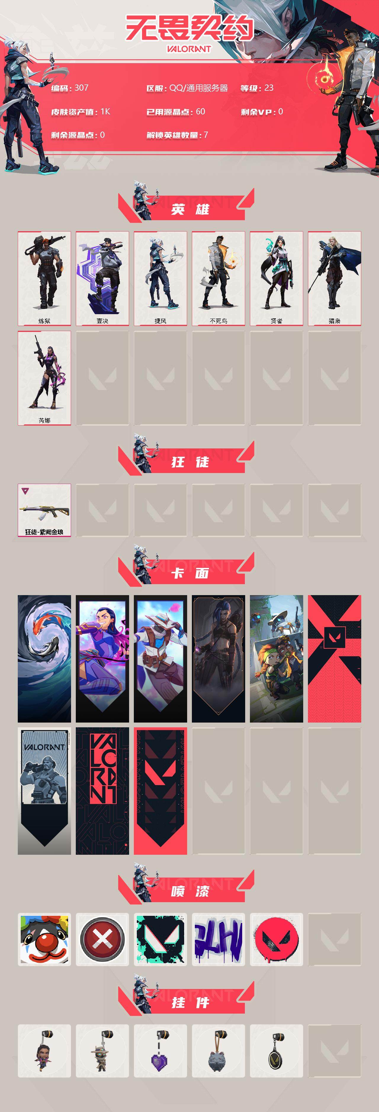 [12956735]【英雄】:炼狱,壹决,捷风,不死鸟,贤者,猎枭,芮娜 【狂徒】:狂徒-紫阙金琅 【卡面】:红鳞松叶 卡面,无畏契约GO!第一卷:芮娜 卡面,无畏契约GO!第一卷:零 卡面,《双城之战》金克丝 卡面,别冒尖 卡面,代号红色 卡面,新兵报到 卡面,V契约 卡面,无畏契约 卡面 【喷漆】:小丑猫 喷漆,买装还是存钱 喷漆,胜利属于无畏契约 喷漆,GLHF 喷漆,无畏契约 喷漆 【挂饰】:无畏契约GO!第一卷 芮娜 挂饰,无畏契约GO!第一卷 零 挂饰,薰衣草之心 挂饰,《双城之战》魄罗 挂饰,无畏契约 纪念币 挂饰