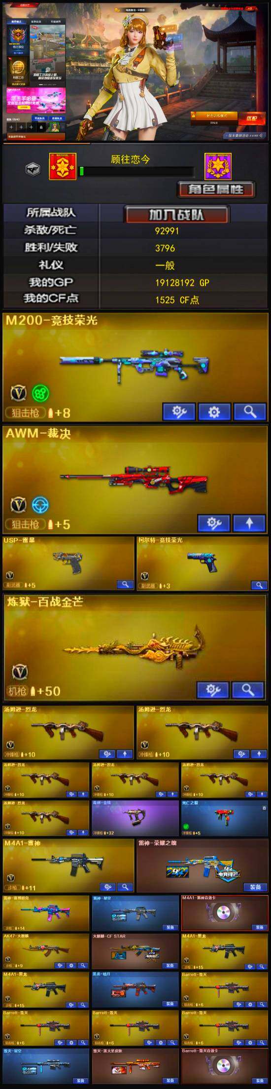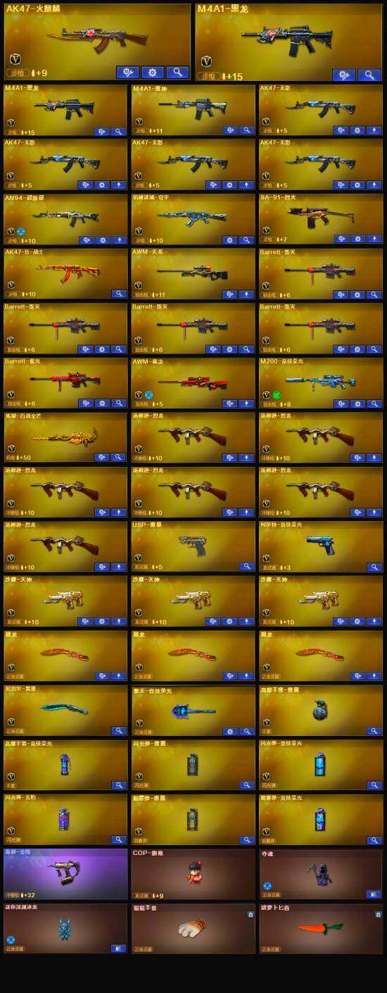【英雄级武器】:M200-竞技荣光,柯尔特-竞技荣光,擎天-竞技荣光,高爆手雷-竞技荣光,烟雾弹-竞技荣光,闪光弹-竞技荣光,USP-雷暴,M4A1-雷神,M4A1-黑龙*2,汤姆逊-烈龙*6,AK47-无影*4,AK47-火麒麟,AN94-超新星,AWM-天龙,Barrett-毁灭*4,Barrett-极光,AWM-裁决,AK-47-猩红传说*3,沙鹰-天神*3,屠龙*3
