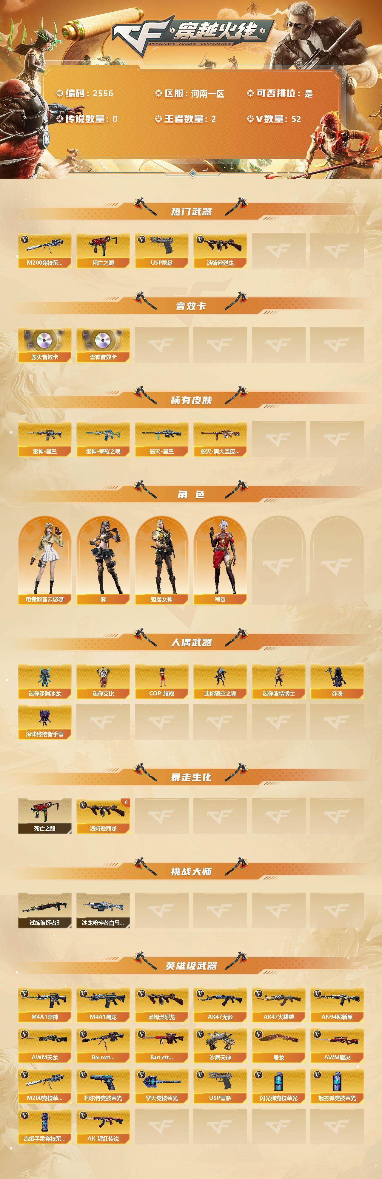 [12957294]河南一区-52V-2王者-0炫金 【热门武器】:M200-竞技荣光,死亡之眼,汤姆逊-烈龙*6,USP-雷暴 【音效卡】:M4A1-雷神音效卡,Barrett-毁灭音效卡 【稀有皮肤】:雷神-荣耀之魄,雷神-星空,毁灭-星空,毁灭-黑大圣皮肤 【角色】:堕落女神,葵,电竞教官-云悠悠,蜀雪 【人偶武器】:COP-旗袍,迷你深渊冰龙,迷你艾比,迷你裂空之翼,迷你波特博士,夺魂,深渊终结者手雷 【暴走生化】:死亡之眼 【挑战大师】:试炼破坏者III,冰龙粉碎者-白马银枪 【英雄级武器】:M200-竞技荣光,柯尔特-竞技荣光,擎天-竞技荣光,高爆手雷-竞技荣光,烟雾弹-竞技荣光,闪光弹-竞技荣光,USP-雷暴,M4A1-雷神,M4A1-黑龙*2,汤姆逊-烈龙*6,AK47-无影*4,AK47-火麒麟,AN94-超新星,AWM-天龙,Barrett-毁灭*4,Barrett-极光,AWM-裁决,AK-47-猩红传说*3,沙鹰-天神*3,屠龙*3 【特殊枪械】:6烈龙