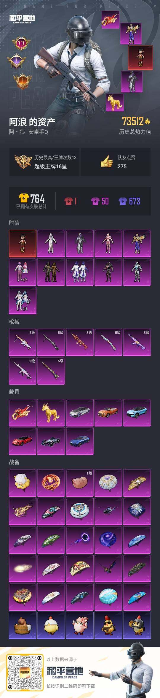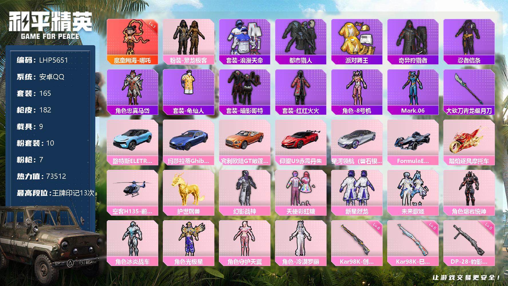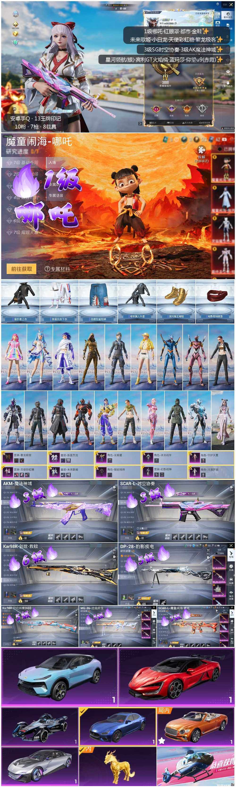 [12956833]素材身法号 安卓 手Q-1神装-10粉装-7特效枪-9载具-5粉色飞行器-7.3w热力值-13王牌印记-165套装-182枪皮【红色神装等级】:魔童闹海-哪吒(一级)【热门品类】:粉装-繁龙极客,套装-浪漫天命,套装-都市猎人,套装-派对舞王,套装-奇异狩猎者,套装-忍者信条,角色-忠真马岱,套装-龟仙人,套装-暗影哥特,套装-红红火火,角色-8号机,角色-Mark.06,大砍刀-青龙偃月刀【粉色载具】:路特斯ELETRE(冰川蓝),玛莎拉蒂Ghibli(蓝),宾利欧陆GT敞篷(火焰橘),仰望U9(赤霞丹朱),星河领航(磐石银),Formula E Gen2(幽光蓝),踏焰逐风摩托车,空客H135-蔚蓝之翼,护世瑞兽【粉色套装】:粉装-幻影战神,粉装-天使彩虹糖,粉装-新星烈龙,粉装-未来歌姬,角色-熔岩统帅,角色-冰炎战车,粉装-繁龙极客,角色-光极星,角色-守护天翼,角色-冷漠罗丽【粉色枪皮等级】:AKM-魔法神域(三级),SCAR-L-时空协奏(三级),SCAR-L-魔童闹海 哪吒(三级),Kar98K-创世·救赎(六级),Kar98K-巳巳如意(五级),DP-28-豹影疾电(五级),MG-36-沧焰双生(五级)【粉色飞行器】:齐天大圣飞行器,繁龙极客飞行器,深渊漩涡飞行器,万象金身飞行器,飞天猪飞行器
