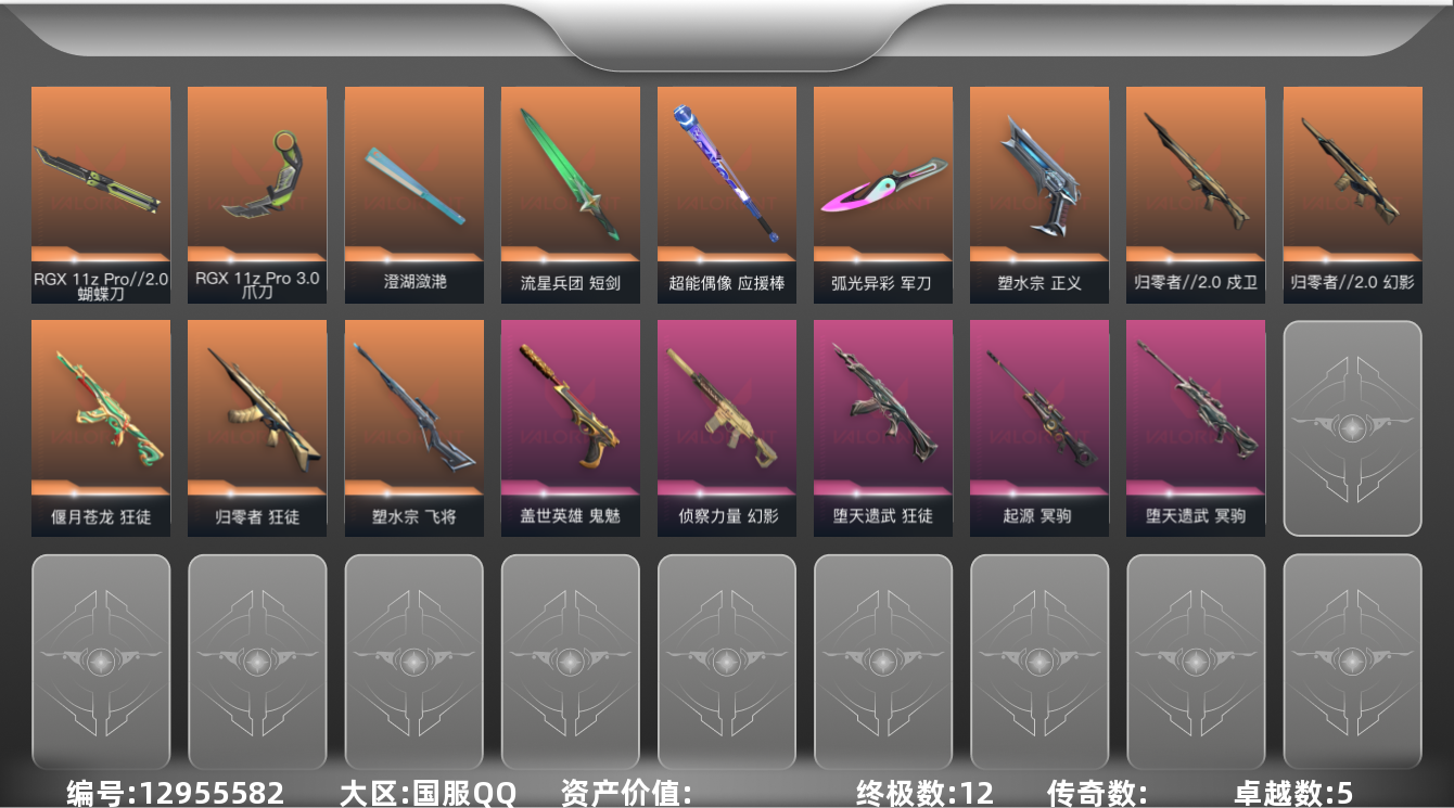 [12955582]【英雄】:幻棱,炼狱,维斯,暮蝶,钛狐,壹决,铁臂,捷风,雷兹,幽影,不死鸟,贤者,猎枭,蝰蛇,零,芮娜,奇乐,尚勃勒,霓虹,斯凯,夜露,星礈,K/O,海神,盖可,黑梦,钢锁 【近战 武器】:近战武器-RGX 11z Pro//3.0 爪刀,近战武器-RGX 11z Pro//2.0 蝴蝶刀,近战武器-澄湖潋滟,近战武器-流星兵团 短剑,近战武器-超能偶像 应援棒,近战武器-弧光异彩 军刀 【狂徒】:狂徒-归零者,狂徒-偃月苍龙,狂徒-堕天遗武,狂徒-超能偶像,狂徒-弧光异彩,狂徒-流星兵团 【幻影】:幻影-归零者//2.0,幻影-侦察力量,幻影-噬源兽防卫工程,幻影-聚合之力 【戍卫】:戍卫-归零者//2.0,戍卫-超能偶像,戍卫-彩梦之城,戍卫-沙场老兵,戍卫-战术熊与伙伴们 【獠犬】:獠犬-弧光异彩,獠犬-采蜜小蜂队 【冥驹】:冥驹-堕天遗武,冥驹-起源 【飞将】:飞将-塑水宗,飞将-聚合之力,飞将-信手涂鸦,飞将-战术熊与伙伴们 【莽侠】:莽侠-纤云弄巧 【战神】:战神-采蜜小蜂队 【奥丁】:奥丁-流星兵团,奥丁-信手涂鸦 【判官】:判官-超能偶像,判官-采蜜小蜂队 【雄鹿】:雄鹿-彩梦之城 【骇灵】:骇灵-流星兵团,骇灵-信手涂鸦 【蜂刺】:蜂刺-弧光异彩,蜂刺-聚合之力,蜂刺-纤云弄巧 【标配】:标配-超能偶像,标配-彩梦之城,标配-战术熊与伙伴们 【正义】:正义-塑水宗,正义-超限闪存,正义-沙尘幻旅,正义-复古浪潮,正义-纳米打击,正义-戍卫者,正义-纤云弄巧 【鬼魅】:鬼魅-盖世英雄,鬼魅-流星兵团,鬼魅-采蜜小蜂队,鬼魅-光导纤维,鬼魅-数码咒术,鬼魅-信手涂鸦,鬼魅-星云暗涌 【狂怒】:狂怒-聚合之力,狂怒-战术熊与伙伴们 【短炮】:短炮-弧光异彩,短炮-纤云弄巧 【卡面】:终章:激斗汉堡 卡面,进入射程 卡面,《双城之战》拥抱 卡面,精灵大战 卡面,欢迎来到底城 卡面,南瓜盛典 卡面,VCT CN首冠 卡面,修车达人 卡面,热舞环节 卡面,正义的化身 卡面,终章:生意人麦宝 卡面,铁之华 卡面,失而复得 卡面,时间到 卡面,最高舞台 卡面,复活专家 卡面,归乡 // 蝰蛇 卡面,RGX 11z Pro//3.0 卡面,超能偶像 卡面,生意人麦宝 卡面,声感陷阱设计图 卡面,红鳞松叶 卡面,霓帧牛蛙 卡面,钢锁工牌 卡面,战术小伙伴的夏日 卡