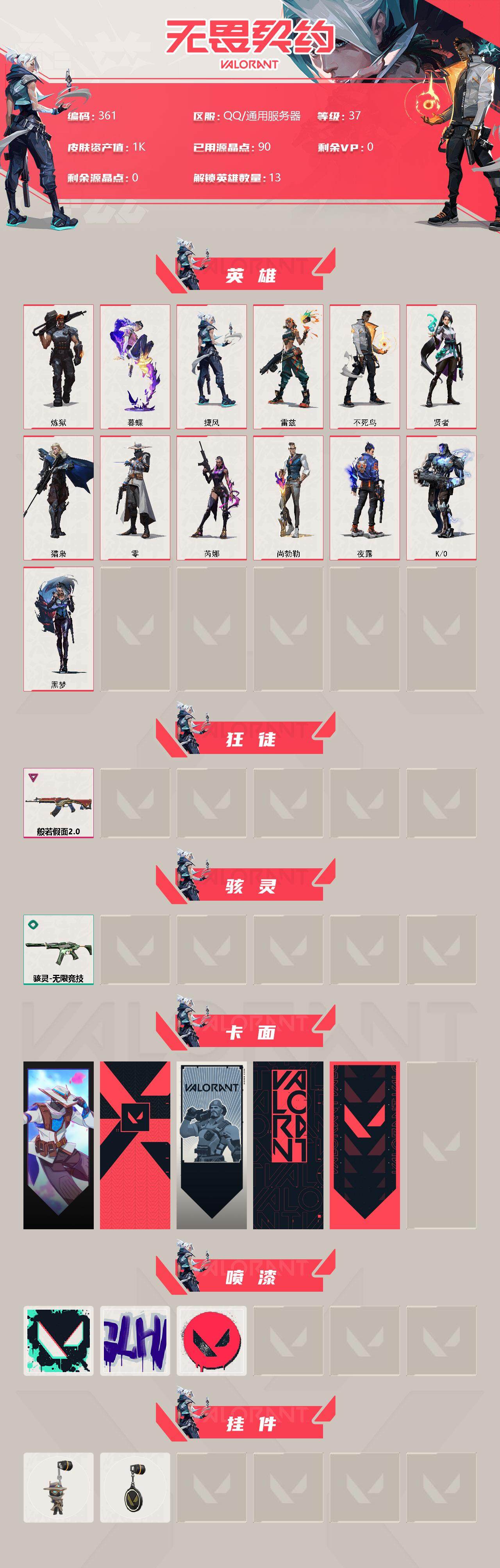 [12957424]【英雄】:炼狱,暮蝶,捷风,雷兹,不死鸟,贤者,猎枭,零,芮娜,尚勃勒,夜露,K/O,黑梦 【狂徒】:狂徒-般若假面//2.0 【骇灵】:骇灵-无限竞技 【卡面】:无畏契约GO!第一卷:零 卡面,代号红色 卡面,新兵报到 卡面,V契约 卡面,无畏契约 卡面 【喷漆】:胜利属于无畏契约 喷漆,GLHF 喷漆,无畏契约 喷漆 【挂饰】:无畏契约GO!第一卷 零 挂饰,无畏契约 纪念币 挂饰