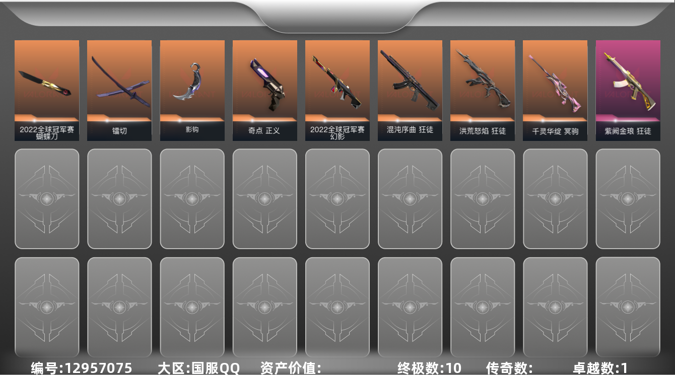 [12957075]【套装】:2022全球冠军赛套装 【英雄】:幻棱,炼狱,暮蝶,钛狐,壹决,铁臂,捷风,雷兹,幽影,不死鸟,贤者,猎枭,零,芮娜,奇乐,尚勃勒,霓虹,斯凯,夜露,K/O,海神,盖可,黑梦 【近战 武器】:近战武器-2022全球冠军赛 蝴蝶刀,近战武器-影钩,近战武器-镭切 【狂徒】:狂徒-洪荒怒焰,狂徒-混沌序曲,狂徒-紫阙金琅 【幻影】:幻影-2022全球冠军赛 【冥驹】:冥驹-千灵华绽 【正义】:正义-奇点 【卡面】:树懒大作战 卡面,无畏契约GO!第一卷:零 卡面,《双城之战》金克丝 卡面,代号红色 卡面,新兵报到 卡面,V契约 卡面,无畏契约 卡面 【喷漆】:买装还是存钱 喷漆,松叶 喷漆,胜利属于无畏契约 喷漆,GLHF 喷漆,无畏契约 喷漆 【挂饰】:无畏契约 纪念币 挂饰