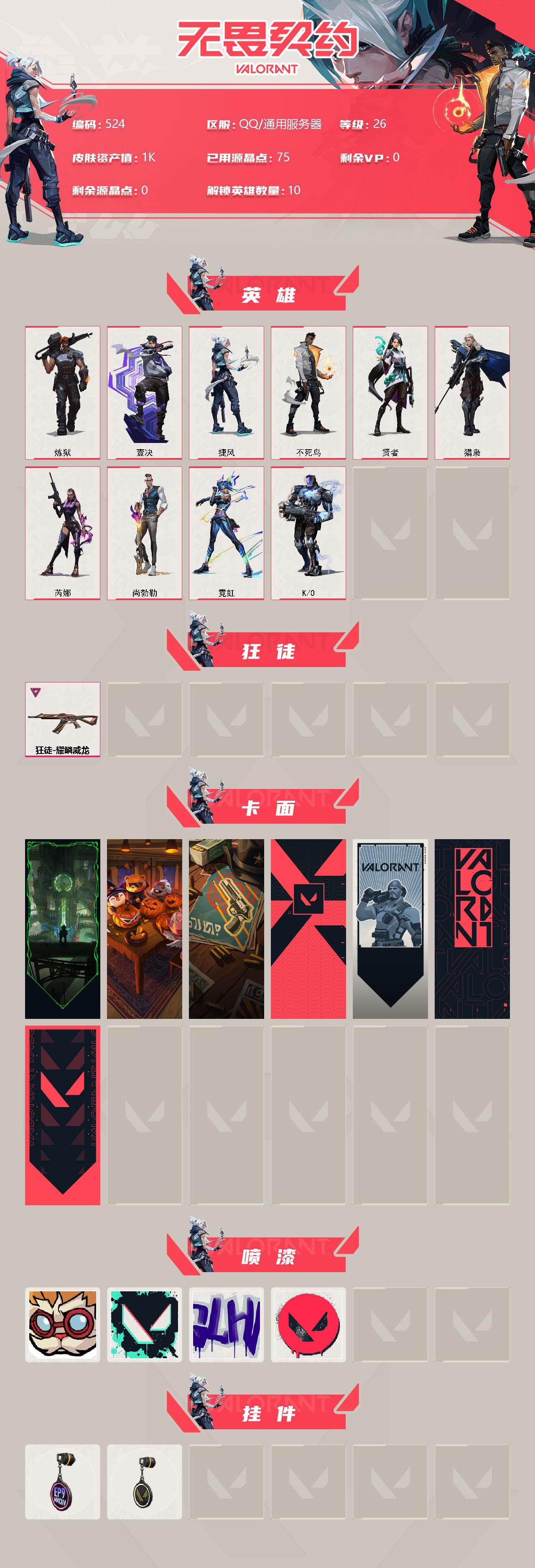 [12958478]【英雄】:炼狱,壹决,捷风,不死鸟,贤者,猎枭,芮娜,尚勃勒,霓虹,K/O 【狂徒】:狂徒-耀鳞威龙 【卡面】:欢迎来到底城 卡面,南瓜盛典 卡面,正义的化身 卡面,代号红色 卡面,新兵报到 卡面,V契约 卡面,无畏契约 卡面 【喷漆】:都算到了 喷漆,胜利属于无畏契约 喷漆,GLHF 喷漆,无畏契约 喷漆 【挂饰】:第九季//第三幕 纪念币 挂饰,无畏契约 纪念币 挂饰