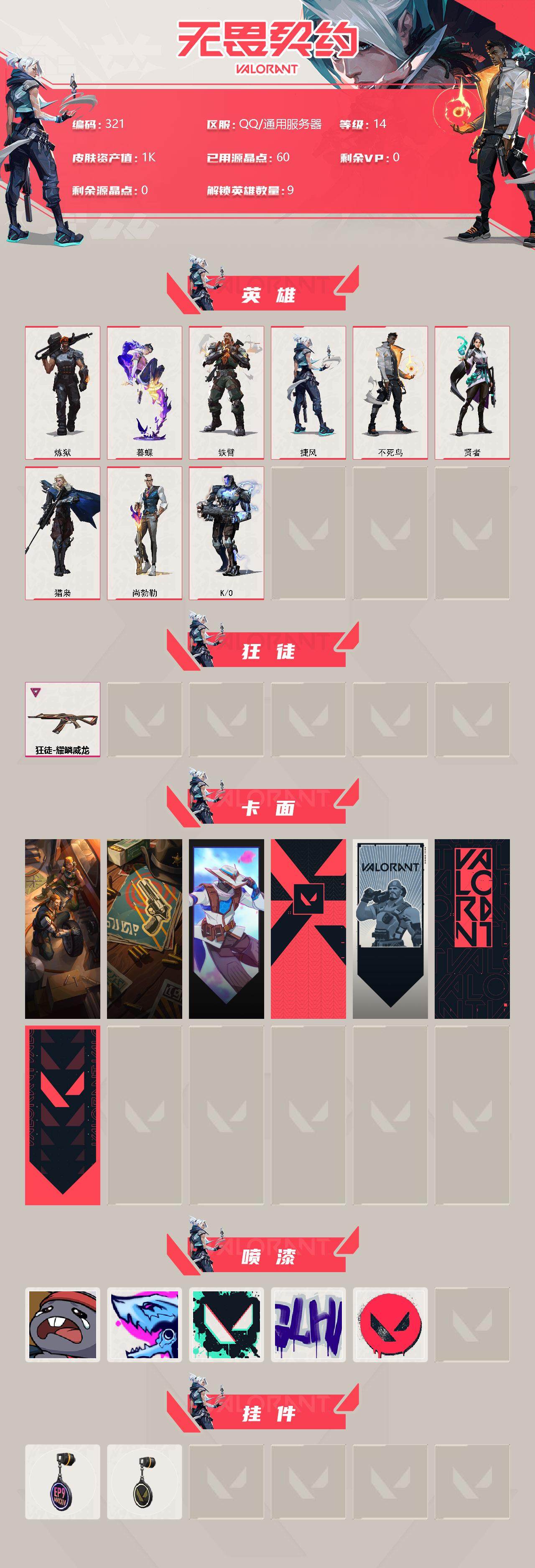 [12957085]【英雄】:炼狱,暮蝶,铁臂,捷风,不死鸟,贤者,猎枭,尚勃勒,K/O 【狂徒】:狂徒-耀鳞威龙 【卡面】:修车达人 卡面,正义的化身 卡面,无畏契约GO!第一卷:零 卡面,代号红色 卡面,新兵报到 卡面,V契约 卡面,无畏契约 卡面 【喷漆】:熊抱 喷漆,暴走萝莉 喷漆,胜利属于无畏契约 喷漆,GLHF 喷漆,无畏契约 喷漆 【挂饰】:第九季//第二幕 纪念币 挂饰,无畏契约 纪念币 挂饰