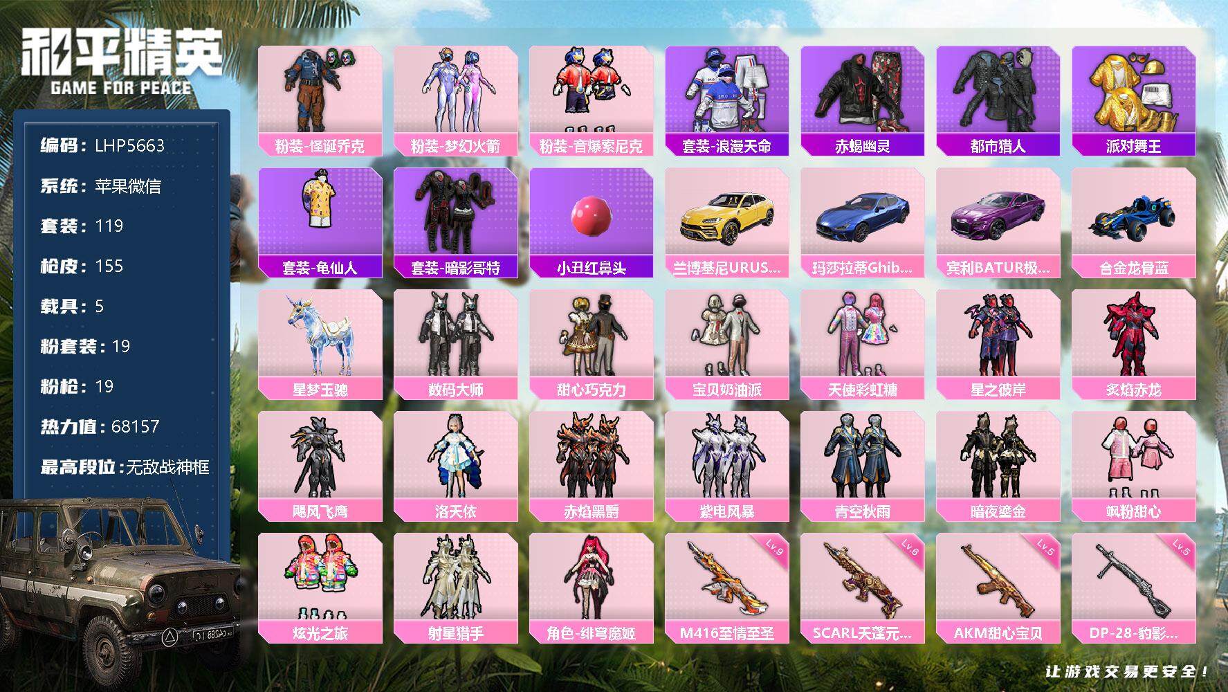 [12956986]素材身法号/M416-至情至圣(九级)/无敌战神框1/绝世印记1 苹果 微信-无敌战神框-19粉装-19特效枪-5载具-5粉色飞行器-6.8w热力值-6王牌印记-119套装-155枪皮【热门品类】:粉装-怪诞乔克,粉装-梦幻火箭,粉装-音爆索尼克,套装-浪漫天命,套装-赤蝎幽灵,套装-都市猎人,套装-派对舞王,套装-龟仙人,套装-暗影哥特,小丑红鼻头【粉色载具】:兰博基尼URUS(明艳黄),玛莎拉蒂Ghibli(蓝),宾利BATUR(极速紫),合金龙骨(蓝),星梦玉骢【粉色套装】:粉装-数码大师,粉装-怪诞乔克,粉装-甜心巧克力,粉装-宝贝奶油派,粉装-天使彩虹糖,粉装-梦幻火箭,粉装-星之彼岸,粉装-炙焰赤龙,粉装-飓风飞鹰,角色-洛天依,粉装-赤焰黑爵,粉装-紫电风暴,粉装-青空秋雨,粉装-暗夜鎏金,粉装-音爆索尼克,粉装-飒粉甜心,粉装-炫光之旅,粉装-射星猎手,角色-绯穹魔姬【粉色枪皮等级】:AKM-甜心宝贝(五级),AKM-星际浪客(一级),SCAR-L-天蓬元帅(六级),M416-风花雪月(一级),M416-至情至圣(九级),GROZA-焦糖拿铁(四级),AUG-星之彼岸(一级),AUG-星梦奇缘(三级),M762-冷魅冰骑(四级),UMP45-启明星(四级),Vector-飒粉甜心(四级),野牛-青空秋雨(四级),P90-能量风暴(四级),Kar98K-未来歌姬(二级),M24-莲影清波(一级),SPAS-12-音爆索尼克(四级),DP-28-暗夜鎏金(四级),DP-28-豹影疾电(五级),MG3-洛神天依(四级)【粉色飞行器】:星之彼岸飞行器,纯梦嫁纱飞行翼,全功率超战飞行器