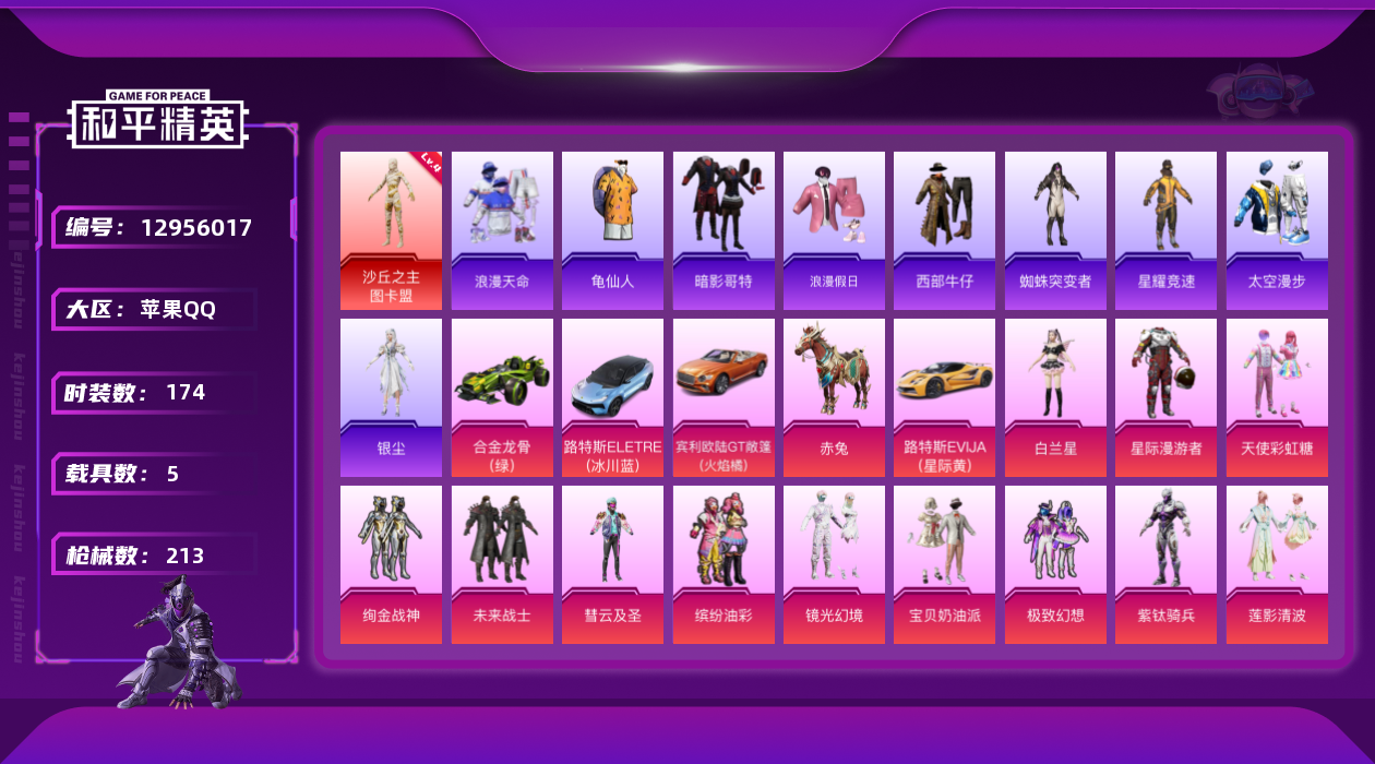 [12956017]素材身法号/沙丘之主-图卡盟(四级) 苹果 手Q-1神装-20粉装-9特效枪-5载具-4粉色飞行器-8.3w热力值-13王牌印记-174套装-213枪皮【红色神装等级】:沙丘之主-图卡盟(四级)【热门品类】:粉装-梦幻火箭,粉装-缤纷油彩,套装-寒蝎幽灵,套装-浪漫天命,套装-派对舞王,角色-军刀雅典娜,套装-金羽特工,套装-沙漠守护者,角色-忠猛周仓,套装-龟仙人,套装-暗影哥特,熔岩游骑兵面罩,大砍刀-青龙偃月刀,撬棍-龙胆亮银枪,熔岩游骑兵连帽夹克【粉色载具】:路特斯EVIJA(星际黄),路特斯ELETRE(冰川蓝),宾利欧陆GT敞篷(火焰橘),合金龙骨(绿),赤兔【粉色套装】:粉装-未来战士,粉装-星际漫游者,粉装-宝贝奶油派,粉装-天使彩虹糖,粉装-梦幻火箭,粉装-缤纷油彩,粉装-放客神游,粉装-彗云及圣,粉装-新星烈龙,粉装-极致幻想,粉装-花间之火,粉装-绚金战神,角色-白兰星,角色-宙之时溯,角色-星云暗核,粉装-莲影清波,粉装-镜光幻境,角色-冰炎战车,角色-紫钛骑兵,角色-圣堂之誓【粉色枪皮等级】:AKM-熔岩统帅(三级),SCAR-L-纯梦嫁纱(六级),M416-心之恋语(五级),M416-风花雪月(二级),P90-沙丘之主(三级),Kar98K-巳巳如意(五级),AWM-花间之火(五级),AWM-橘柚倾心(一级),DP-28-豹影疾电(一级)【粉色飞行器】:梦幻火箭飞行器,齐天大圣飞行器,镜光幻境飞行翼,沙丘之主天马