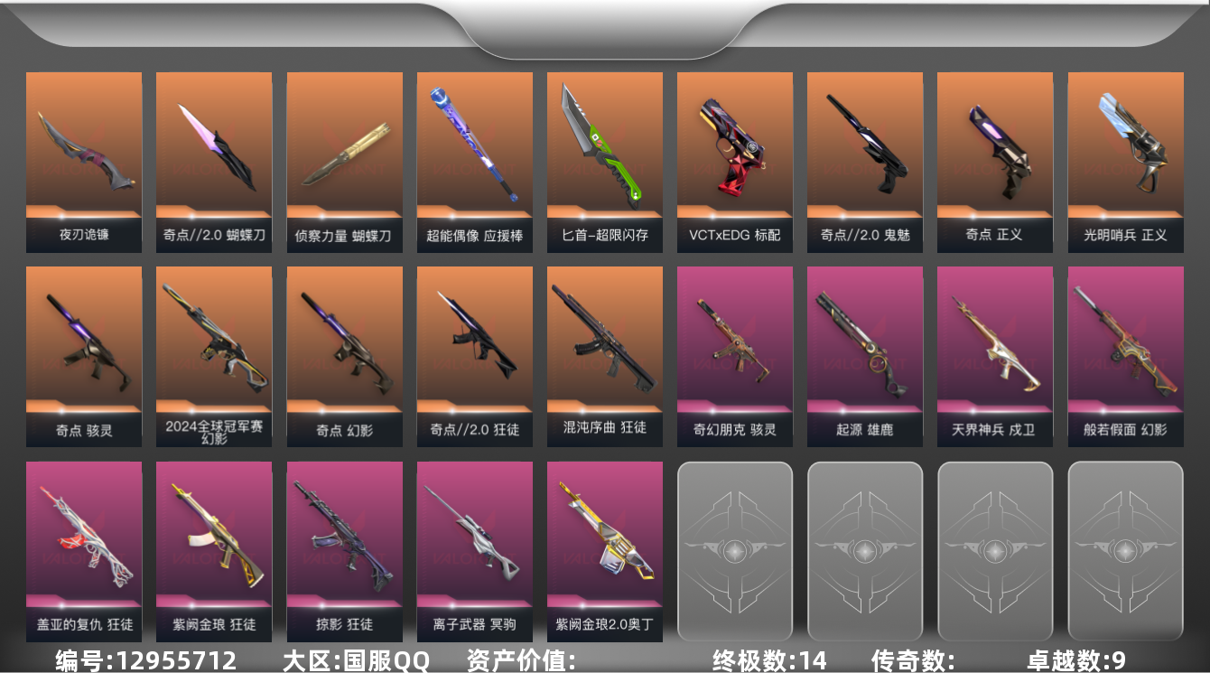 [12955712]【套装】:奇点//2.0套装,VCTxEDG 队伍套装,回火礼包:奇点套装 【英雄】:炼狱,维斯,暮蝶,壹决,铁臂,捷风,雷兹,幽影,不死鸟,贤者,猎枭,蝰蛇,零,芮娜,奇乐,尚勃勒,霓虹,斯凯,夜露,星礈,K/O,海神,盖可,黑梦,钢锁 【近战 武器】:近战武器-奇点//2.0 蝴蝶刀,近战武器-侦察力量 蝴蝶刀,近战武器-超能偶像 应援棒,近战武器-超限闪存 匕首,近战武器-夜刃诡镰 【狂徒】:狂徒-混沌序曲,狂徒-奇点//2.0,狂徒-掠影,狂徒-盖亚的复仇,狂徒-紫阙金琅,狂徒-超能偶像 【幻影】:幻影-2024全球冠军赛,幻影-奇点,幻影-般若假面,幻影-超限闪存,幻影-聚合之力 【戍卫】:戍卫-天界神兵,戍卫-超能偶像,戍卫-浮光跃金 【獠犬】:獠犬-采蜜小蜂队,獠犬-模拟赫兹 【冥驹】:冥驹-离子武器,冥驹-模拟赫兹 【飞将】:飞将-聚合之力 【莽侠】:莽侠-超限闪存 【战神】:战神-采蜜小蜂队,战神-浮光跃金 【奥丁】:奥丁-紫阙金琅//2.0 【判官】:判官-超能偶像,判官-采蜜小蜂队 【雄鹿】:雄鹿-起源,雄鹿-模拟赫兹 【骇灵】:骇灵-奇点,骇灵-奇幻朋克,骇灵-浮光跃金 【蜂刺】:蜂刺-超限闪存,蜂刺-聚合之力 【标配】:标配-超能偶像,标配-浮光跃金 【VCT手枪】:标配-VCT x EDG 【正义】:正义-光明哨兵,正义-奇点,正义-超限闪存,正义-纳米打击 【鬼魅】:鬼魅-奇点//2.0,鬼魅-采蜜小蜂队,鬼魅-模拟赫兹 【狂怒】:狂怒-聚合之力 【卡面】:终章:激斗汉堡 卡面,进入射程 卡面,精灵大战 卡面,南瓜盛典 卡面,唱片的故事 卡面,钢弓与箭弦 卡面,排除故障 卡面,奇点//2.0 卡面,战术桌游 卡面,悠享食光 卡面,修车达人 卡面,热舞环节 卡面,模拟赫兹 卡面,浮光跃金 卡面,超限闪存 卡面,维斯工牌 卡面,正义的化身 卡面,终章:生意人麦宝 卡面,铁之华 卡面,失而复得 卡面,时间到 卡面,最高舞台 卡面,复活专家 卡面,归乡 // 蝰蛇 卡面,超能偶像 卡面,生意人麦宝 卡面,声感陷阱设计图 卡面,钢锁工牌 卡面,战术小伙伴的夏日 卡面,采蜜小蜂队 卡面,聚合之力 卡面,梦幻奶茶 卡面,零点嗅探设计图 卡面,无畏契约GO!第一卷:芮娜 卡面,清除名单 卡面,无畏契约GO!第一卷:零 卡面,暗枪 卡面,代号红色 卡面