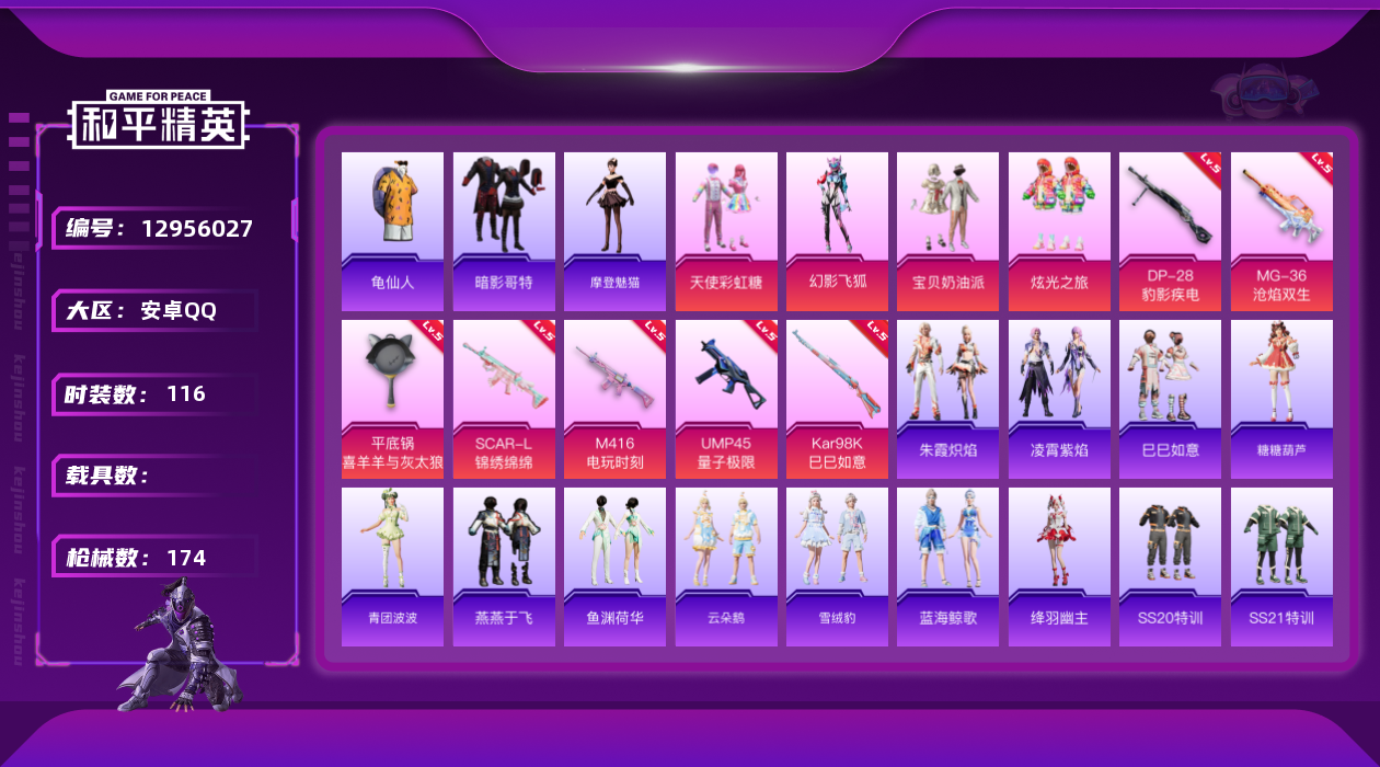 [12956027]安卓 手Q-4粉装-7特效枪-4.8w热力值-6王牌印记-116套装-174枪皮【热门品类】:套装-龟仙人,套装-暗影哥特【粉色套装】:粉装-宝贝奶油派,粉装-天使彩虹糖,粉装-炫光之旅,粉装-幻影飞狐【粉色枪皮等级】:SCAR-L-锦绣绵绵(五级),M416-电玩时刻(五级),UMP45-量子极限(五级),Kar98K-巳巳如意(五级),DP-28-豹影疾电(五级),MG-36-沧焰双生(五级),平底锅-喜羊羊与灰太狼(六级)