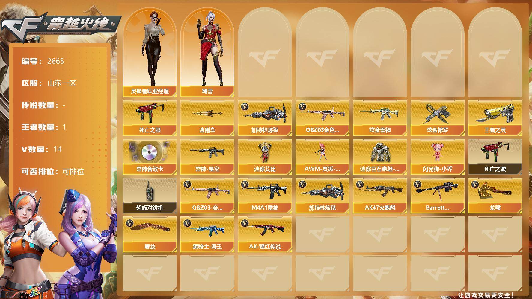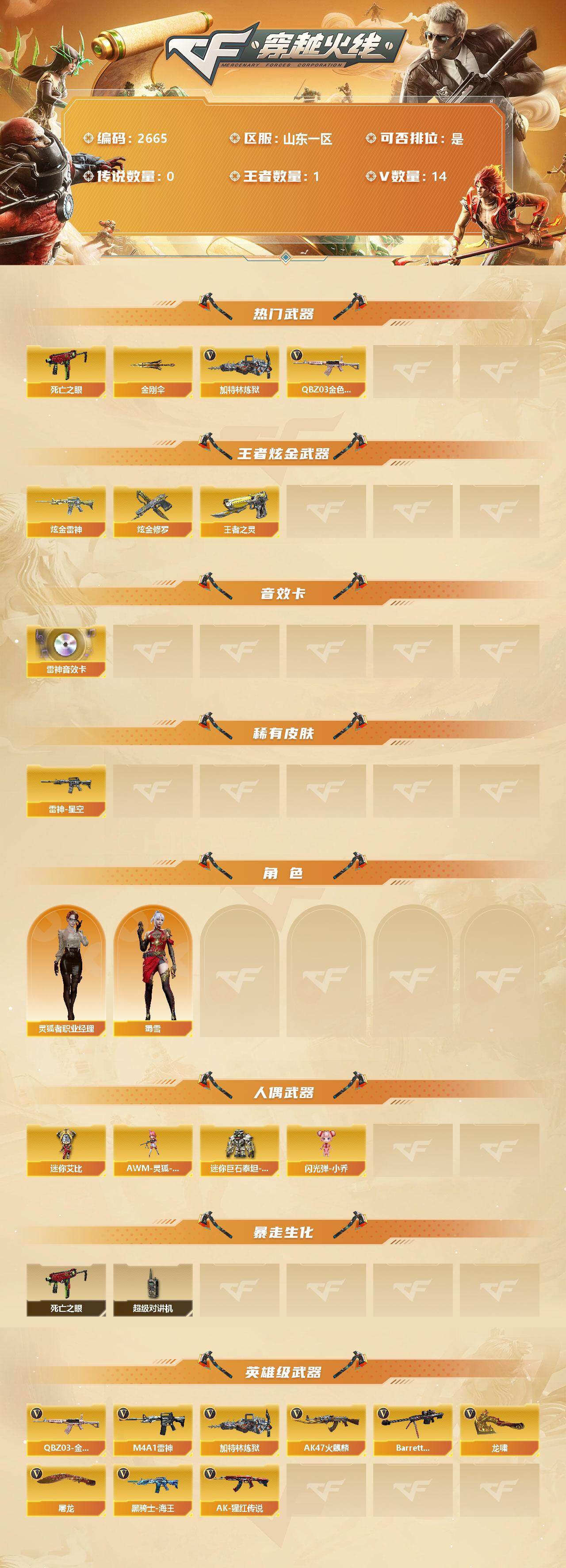 [12958029]山东一区-14V-1王者-2炫金 【热门武器】:QBZ03-金色蔷薇,死亡之眼,加特林-炼狱,金刚伞 【王者炫金武器】:炫金雷神,炫金修罗,王者之灵 【音效卡】:M4A1-雷神音效卡 【稀有皮肤】:雷神-星空 【角色】:灵狐者-职业经理,蜀雪 【人偶武器】:AWM-灵狐-15周年嘉年华,迷你艾比,迷你巨石泰坦-魔花研究所,闪光弹-小乔 【暴走生化】:死亡之眼,超级对讲机 【英雄级武器】:QBZ03-金色蔷薇,M4A1-雷神,加特林-炼狱,AK47-火麒麟,Barrett-毁灭,黑骑士-海王,AK-47-猩红传说,龙啸,屠龙*3 【特殊枪械】:1炼狱