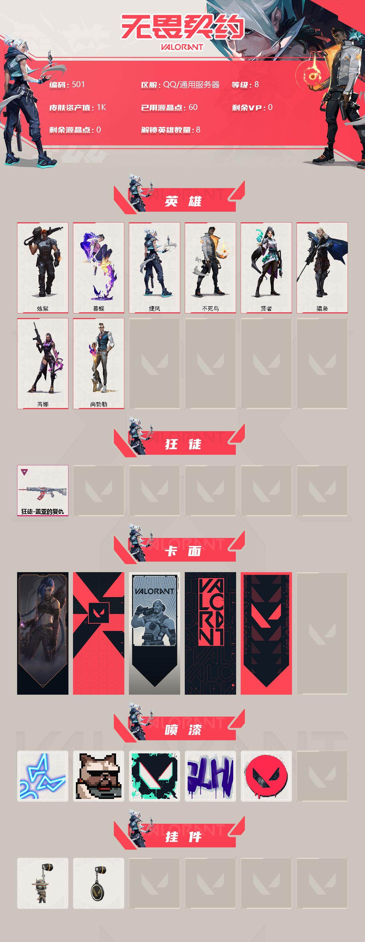 [12958249]【英雄】:炼狱,暮蝶,捷风,不死鸟,贤者,猎枭,芮娜,尚勃勒 【狂徒】:狂徒-盖亚的复仇 【卡面】:《双城之战》金克丝 卡面,代号红色 卡面,新兵报到 卡面,V契约 卡面,无畏契约 卡面 【喷漆】:霓光四射 喷漆,关门放狗 喷漆,胜利属于无畏契约 喷漆,GLHF 喷漆,无畏契约 喷漆 【挂饰】:无畏契约GO!第一卷 零 挂饰,无畏契约 纪念币 挂饰
