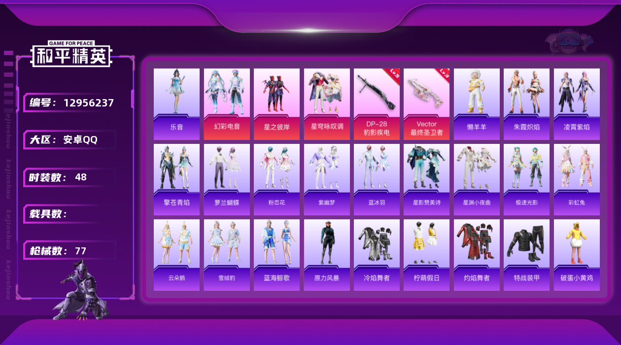 [12956237]安卓 手Q-3粉装-2特效枪-1粉色飞行器-2.1w热力值-3王牌印记-48套装-77枪皮【粉色套装】:粉装-星之彼岸,粉装-星穹咏叹调,粉装-幻彩电音【粉色枪皮等级】:Vector-最终圣卫者(三级),DP-28-豹影疾电(五级)【粉色飞行器】:终晖之翼飞行器