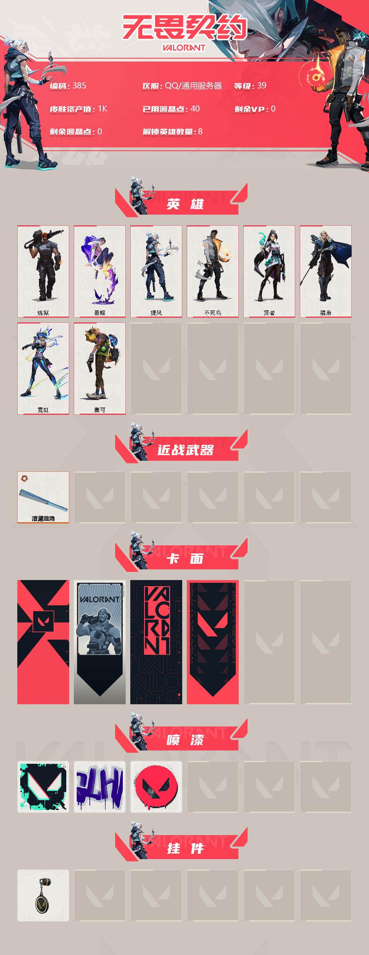 [12957545]【英雄】:炼狱,暮蝶,捷风,不死鸟,贤者,猎枭,霓虹,盖可 【近战 武器】:近战武器-澄湖潋滟 【卡面】:代号红色 卡面,新兵报到 卡面,V契约 卡面,无畏契约 卡面 【喷漆】:胜利属于无畏契约 喷漆,GLHF 喷漆,无畏契约 喷漆 【挂饰】:无畏契约 纪念币 挂饰