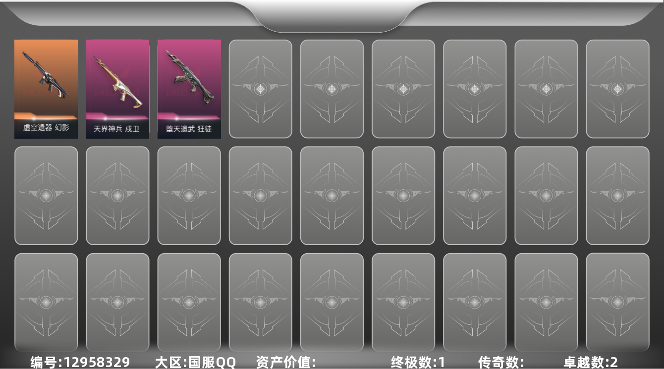 [12958329]【英雄】:炼狱,暮蝶,壹决,捷风,雷兹,不死鸟,贤者,猎枭,芮娜,尚勃勒,盖可,钢锁 【狂徒】:狂徒-堕天遗武 【幻影】:幻影-虚空遗器 【戍卫】:戍卫-天界神兵 【卡面】:无畏契约GO!第一卷:零 卡面,《双城之战》金克丝 卡面,代号红色 卡面,新兵报到 卡面,V契约 卡面,无畏契约 卡面 【喷漆】:霓光四射 喷漆,买装还是存钱 喷漆,关门放狗 喷漆,胜利属于无畏契约 喷漆,GLHF 喷漆,无畏契约 喷漆 【挂饰】:无畏契约GO!第一卷 零 挂饰,无畏契约 纪念币 挂饰