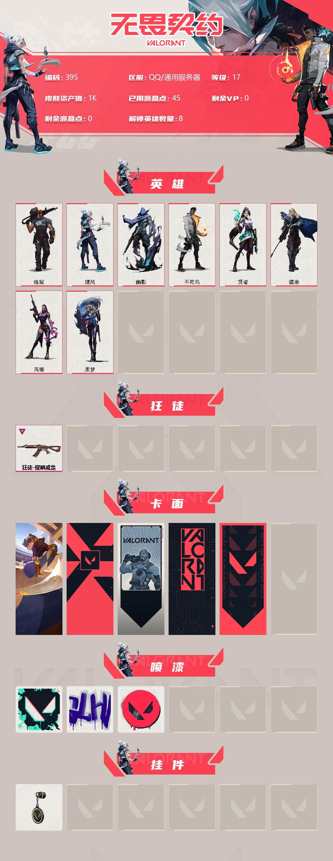 [12957610]【英雄】:炼狱,捷风,幽影,不死鸟,贤者,猎枭,芮娜,黑梦 【狂徒】:狂徒-耀鳞威龙 【卡面】:Clutch 卡面,代号红色 卡面,新兵报到 卡面,V契约 卡面,无畏契约 卡面 【喷漆】:胜利属于无畏契约 喷漆,GLHF 喷漆,无畏契约 喷漆 【挂饰】:无畏契约 纪念币 挂饰