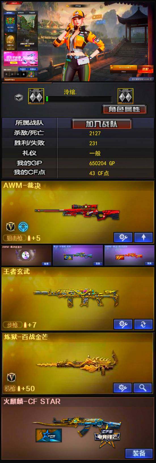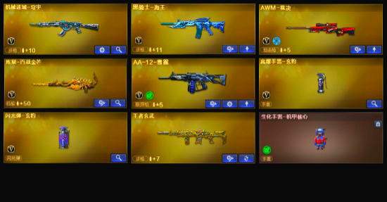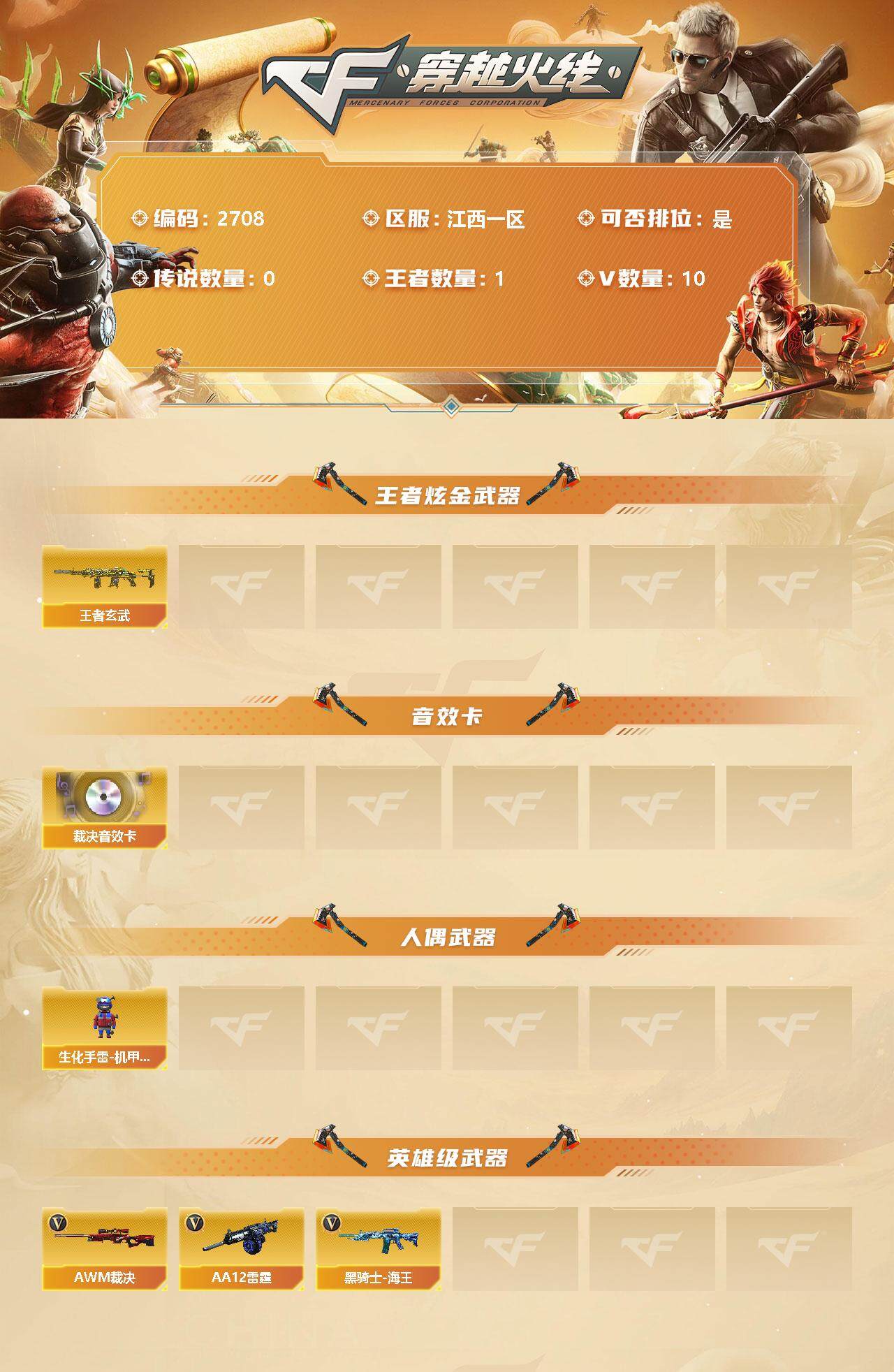 [12958698]江西一区-10V-1王者-0炫金 【王者炫金武器】:王者玄武 【音效卡】:AWM-裁决音效卡 【人偶武器】:生化手雷-机甲核心 【英雄级武器】:AWM-裁决,AA-12-雷霆,黑骑士-海王 【特殊枪械】: