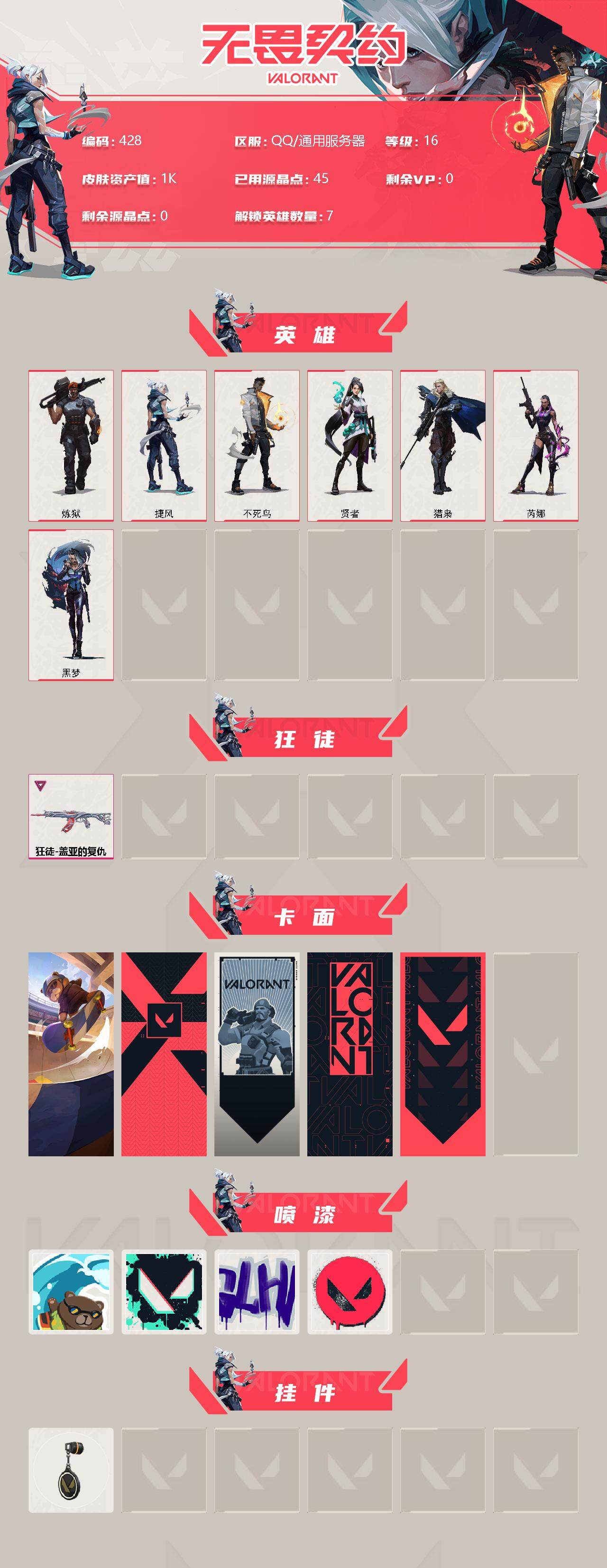 [12957824]【英雄】:炼狱,捷风,不死鸟,贤者,猎枭,芮娜,黑梦 【狂徒】:狂徒-盖亚的复仇 【卡面】:Clutch 卡面,代号红色 卡面,新兵报到 卡面,V契约 卡面,无畏契约 卡面 【喷漆】:酷熊冲浪 喷漆,胜利属于无畏契约 喷漆,GLHF 喷漆,无畏契约 喷漆 【挂饰】:无畏契约 纪念币 挂饰