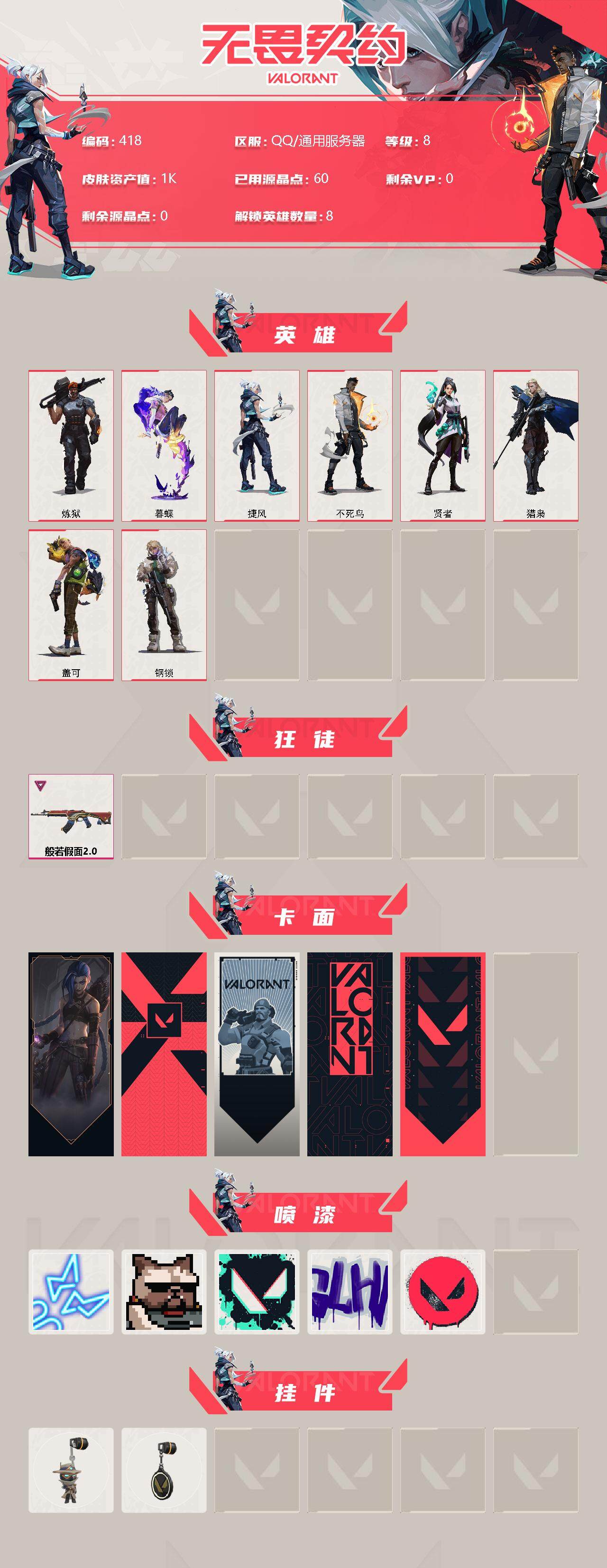 [12957770]【英雄】:炼狱,暮蝶,捷风,不死鸟,贤者,猎枭,盖可,钢锁 【狂徒】:狂徒-般若假面//2.0 【卡面】:《双城之战》金克丝 卡面,代号红色 卡面,新兵报到 卡面,V契约 卡面,无畏契约 卡面 【喷漆】:霓光四射 喷漆,关门放狗 喷漆,胜利属于无畏契约 喷漆,GLHF 喷漆,无畏契约 喷漆 【挂饰】:无畏契约GO!第一卷 零 挂饰,无畏契约 纪念币 挂饰