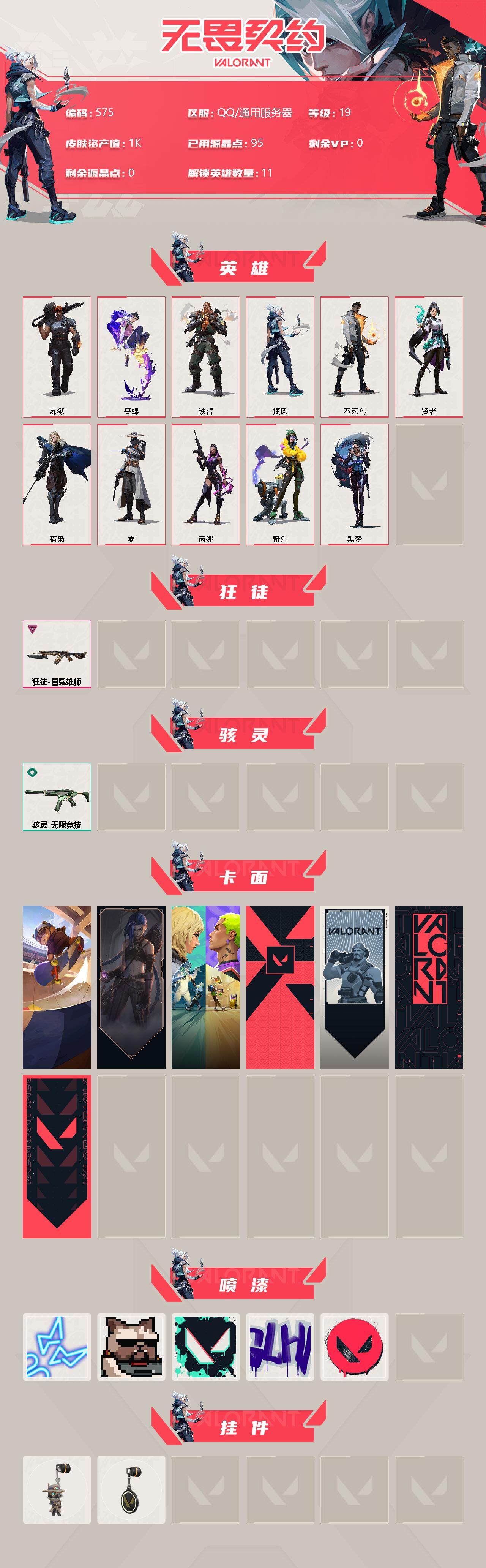 [12958798]【英雄】:炼狱,暮蝶,铁臂,捷风,不死鸟,贤者,猎枭,零,芮娜,奇乐,黑梦 【狂徒】:狂徒-日冕雄师 【骇灵】:骇灵-无限竞技 【卡面】:Clutch 卡面,《双城之战》金克丝 卡面,钢锁vs盖可 卡面,代号红色 卡面,新兵报到 卡面,V契约 卡面,无畏契约 卡面 【喷漆】:霓光四射 喷漆,关门放狗 喷漆,胜利属于无畏契约 喷漆,GLHF 喷漆,无畏契约 喷漆 【挂饰】:无畏契约GO!第一卷 零 挂饰,无畏契约 纪念币 挂饰